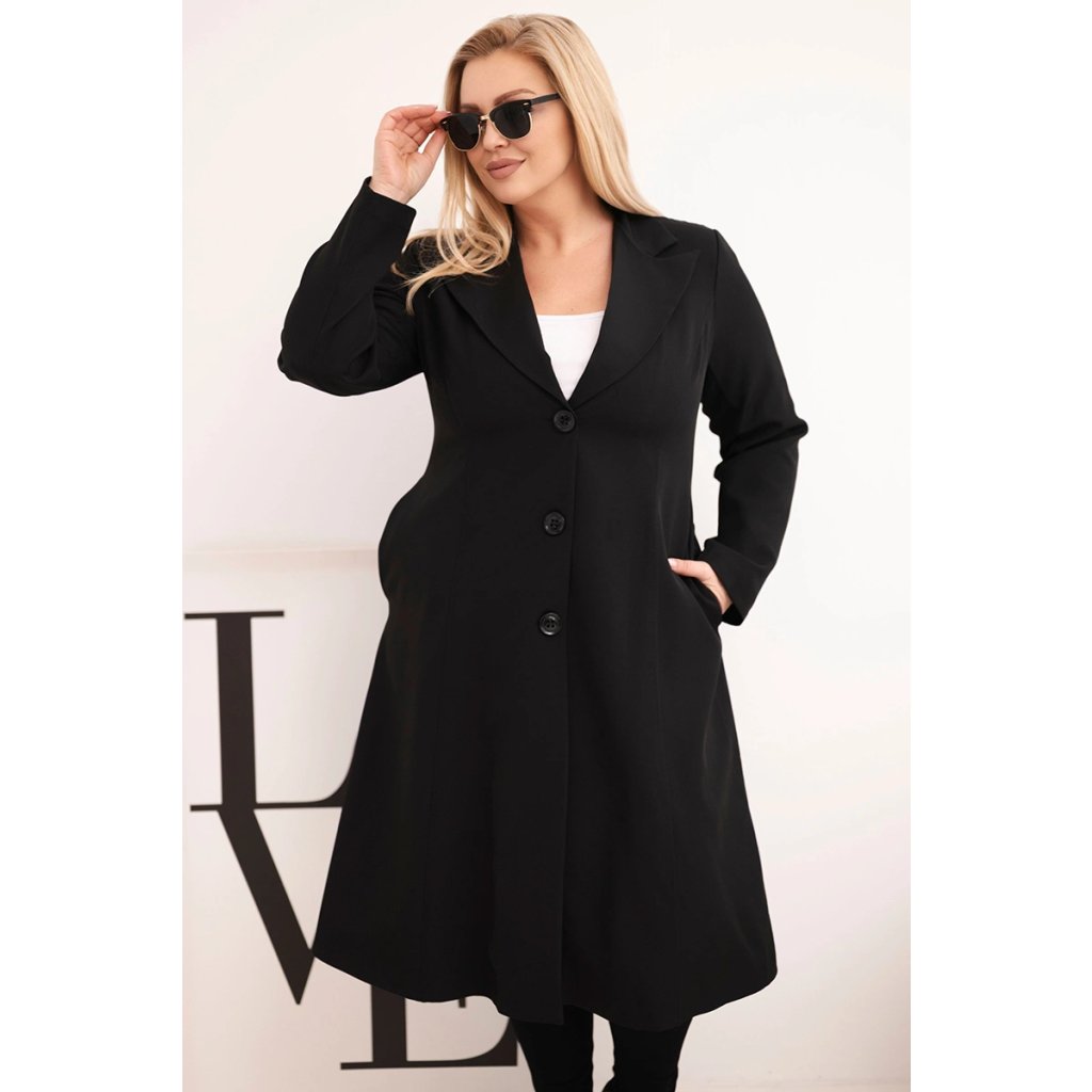 Tento elegantný dámsky kabát s jednoduchým, klasickým strihom je ideálnou voľbou na chladnejšie dni. Model s výrazne označeným golierom a zapínaním na gombíky vyzerá veľmi štýlovo a nadčasovo. Vďaka dĺžke nad kolená a voľnejšiemu strihu poskytuje pohodlie pri nosení a hodí sa k rôznym typom postavy. Ľahko elastický materiál sa dobre prispôsobuje telu a vnútorná podšívka zvyšuje komfort používania. Skvelý do práce, na prechádzku alebo na elegantné vychádzky.