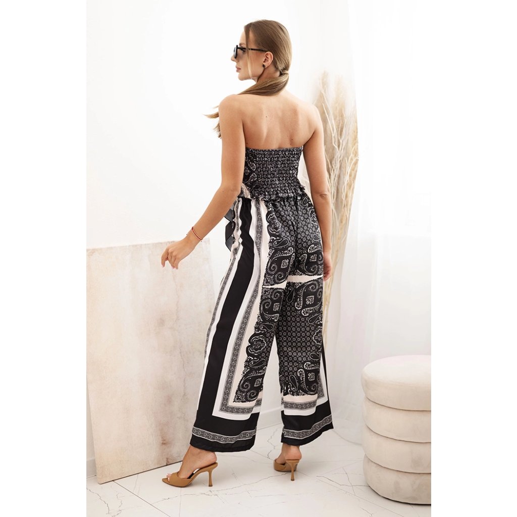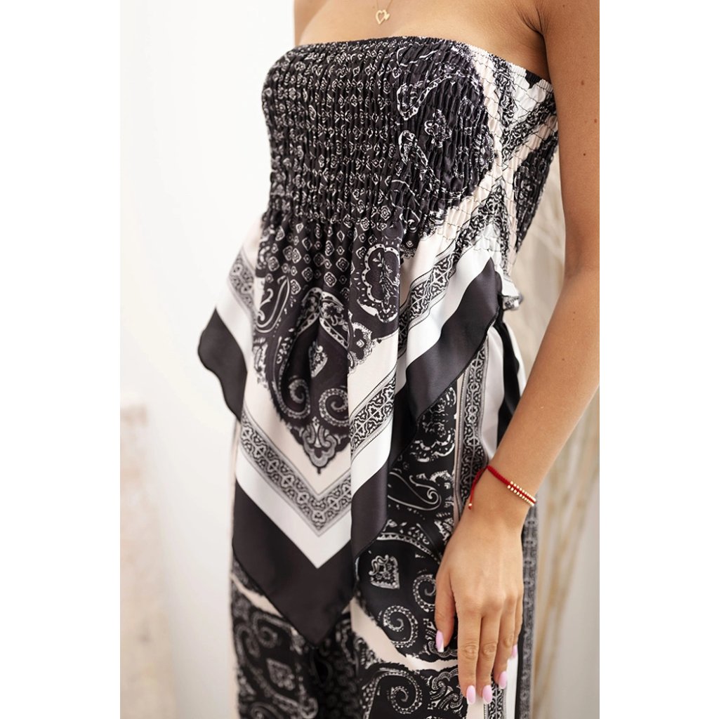 Štýlová dámska súprava skladajúca sa z ľahkého topu typu „carmen“ a širokých nohavíc je ideálnou voľbou na leto, dovolenku alebo mestské prechádzky. Paisley vzor jej dodáva módny vzhľad a vzdušný materiál krásne sadne na postavu. Nohavice majú voľný strih so širokými nohavicami a elastickým pásom, čo zaisťuje maximálne pohodlie. Top s riasením a predĺženým predným dielom je možné nosiť rôznymi spôsobmi – samostatne alebo pod sakom. Táto súprava je ideálna ako na bežné nosenie, tak na špeciálne príležitosti. Veľkosť je univerzálna a hodí sa pre ženy veľkosti S, M alebo L.