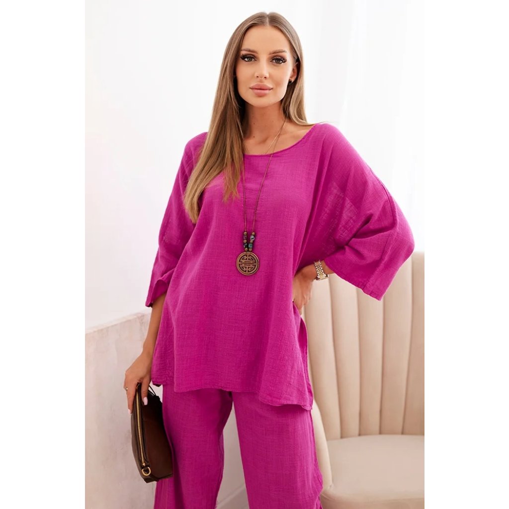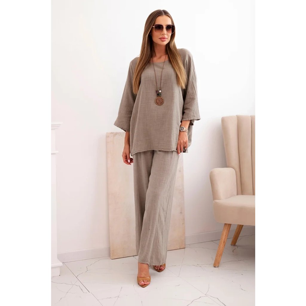 Štýlový dámsky komplet skladajúci sa z ľahkej blúzky s rukávom 3/4 a širokých nohavíc so zaväzovaním v páse, ktorý sa skvele hodí na každodenné nosenie a do casualových štylizácií. Blúzka je ozdobená elegantným náhrdelníkom, ktorý dodáva celku výnimočný charakter a podčiarkuje prirodzený, subtílny štýl. Vyrobené z mäkkej viskózy, zaisťuje pohodlie nosenia a priedušnosť aj v teplejších dňoch. Nohavice so širokou nohavicou zaručujú voľnosť pohybu a módny vzhľad. Veľkosť je univerzálna a bude vhodná pre dámy vo veľkosti S, M alebo L.