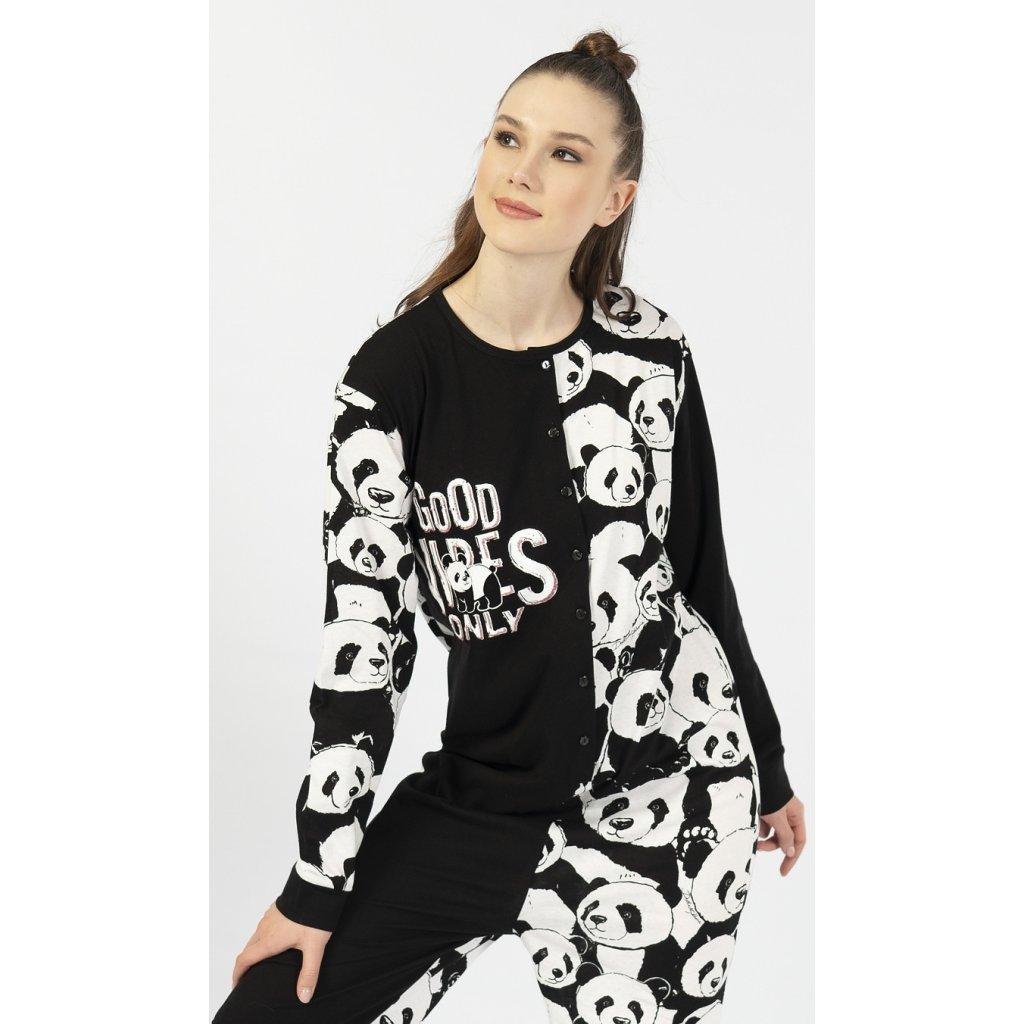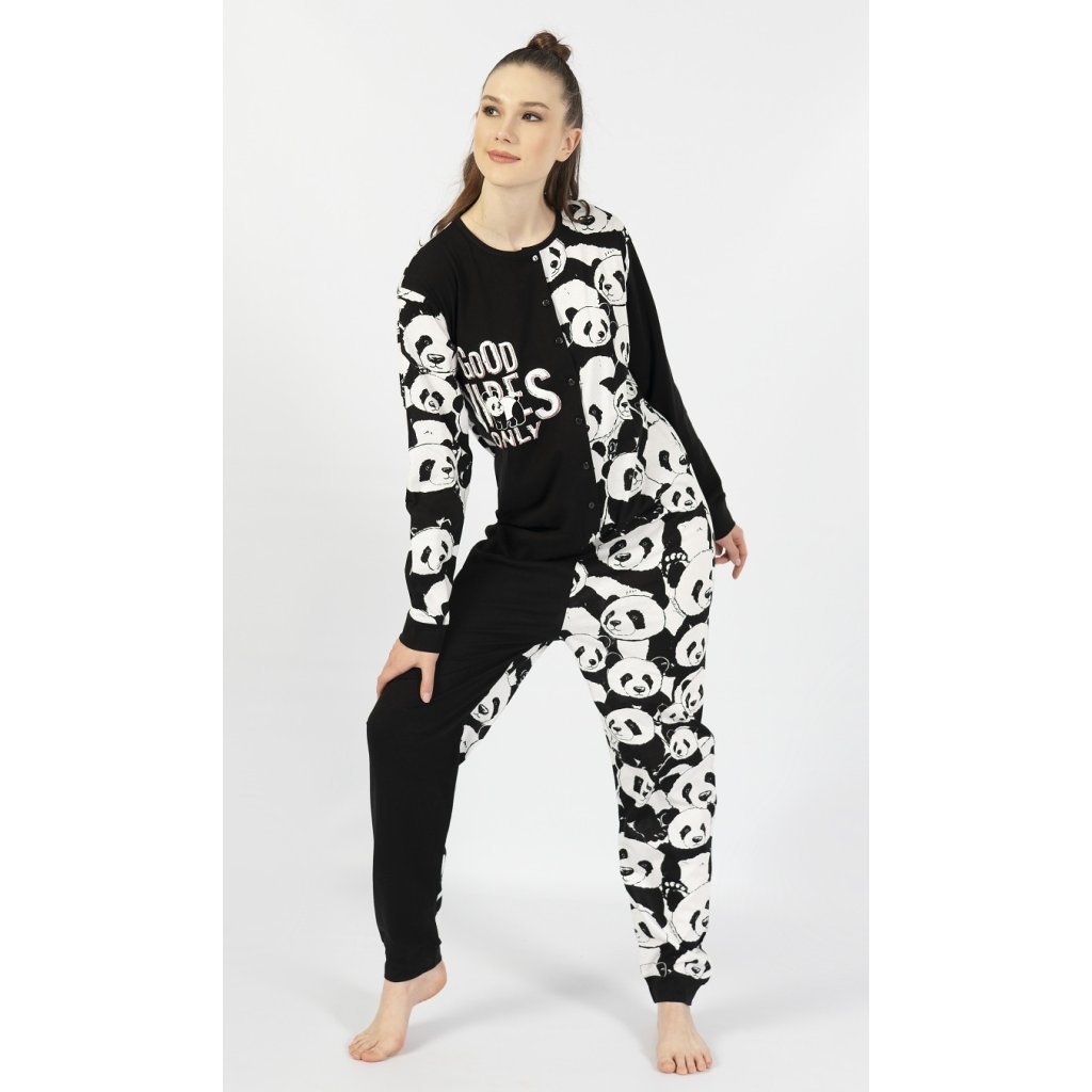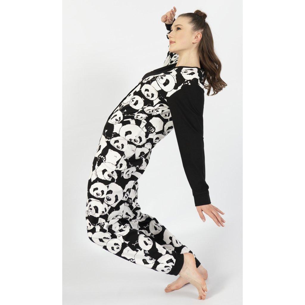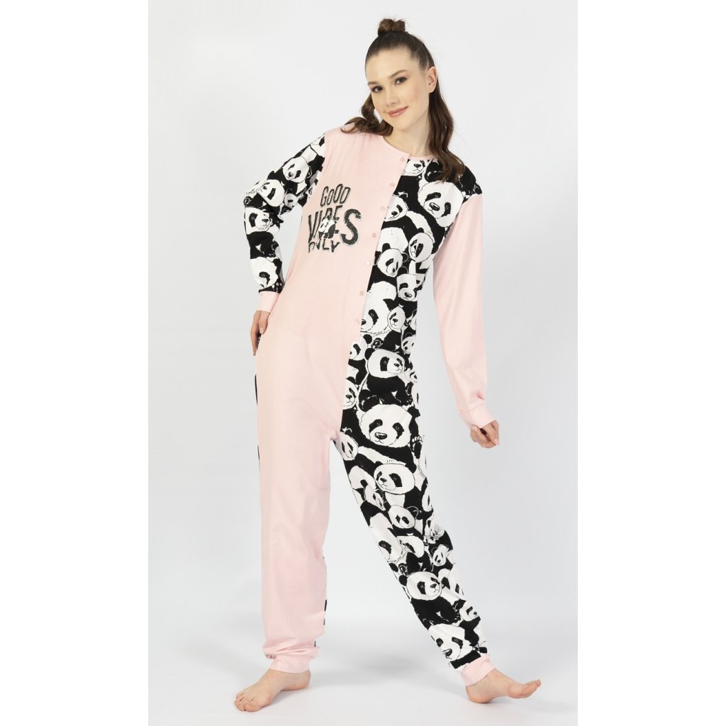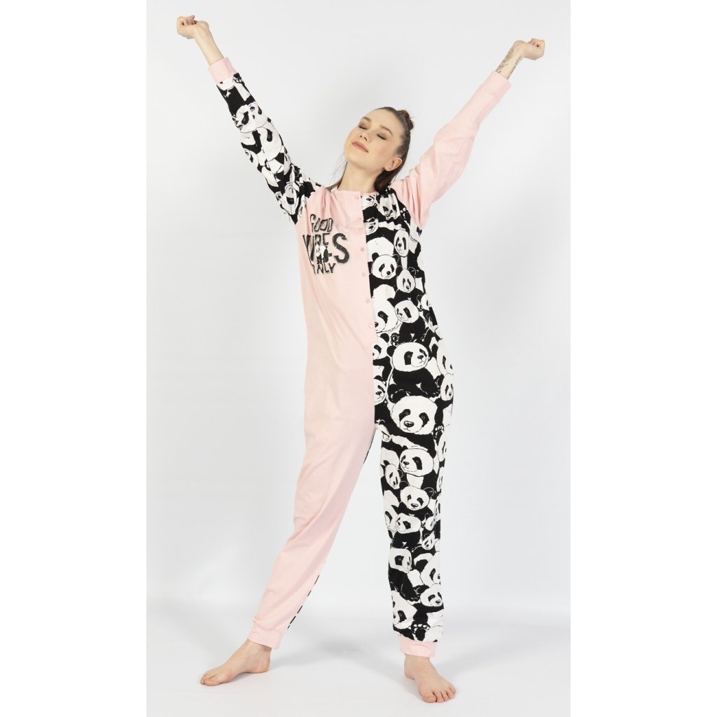 Dámsky bavlnený overal Dobré vibrácie. Kombinéza je celá podšitá - jednu stranu zdobí obrázok pandy a nápis "Good vibes only", druhú stranu celoplošná potlač pandy. Dlhé nohavice sú zakončené elastickými lemami. Bavlnený materiál je pružný a príjemný na dotyk.