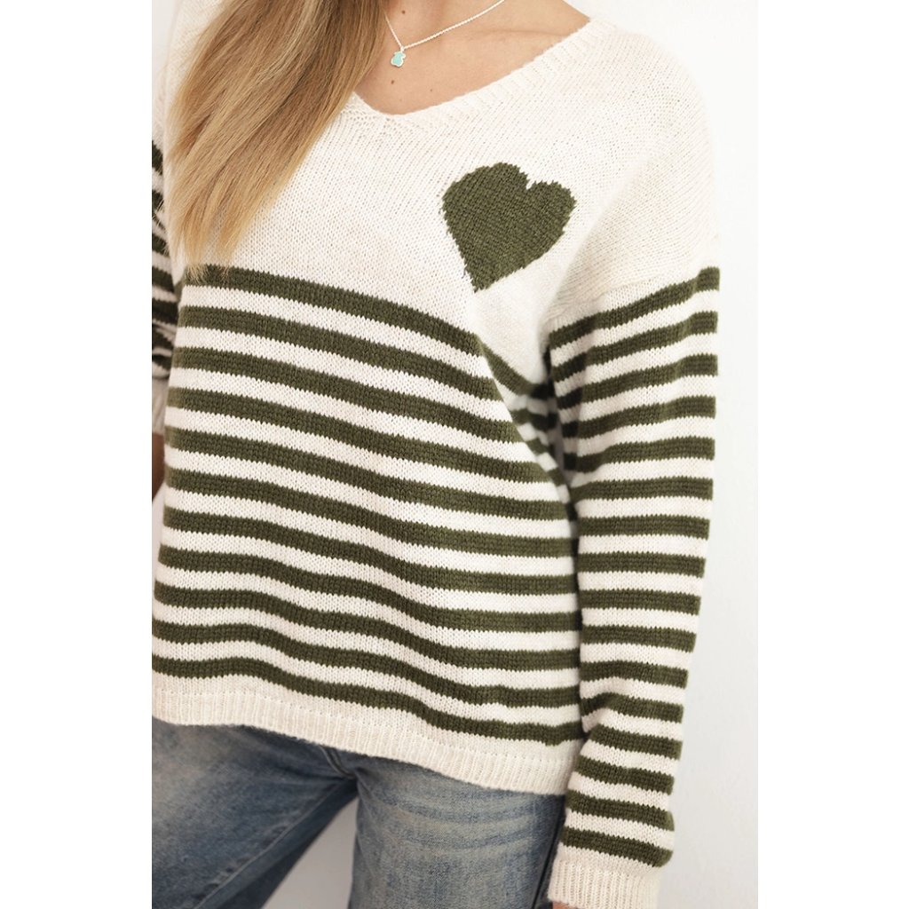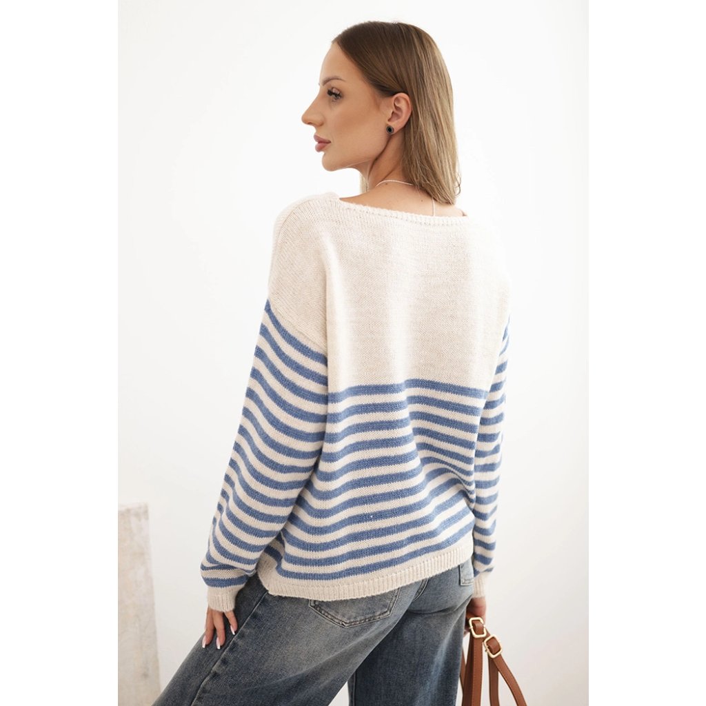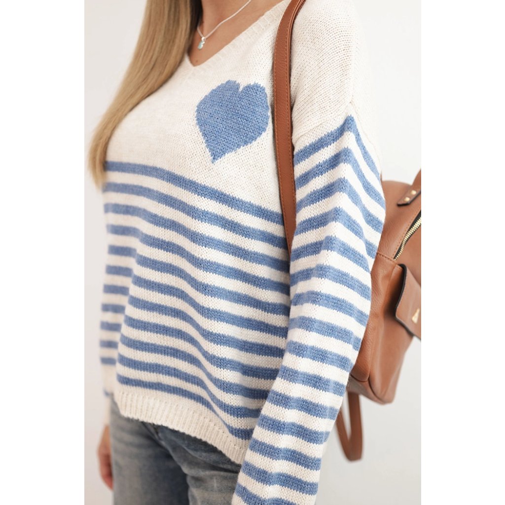 Dámsky sveter pruhovaný srdcom s mohairom a V výstrihom denimový