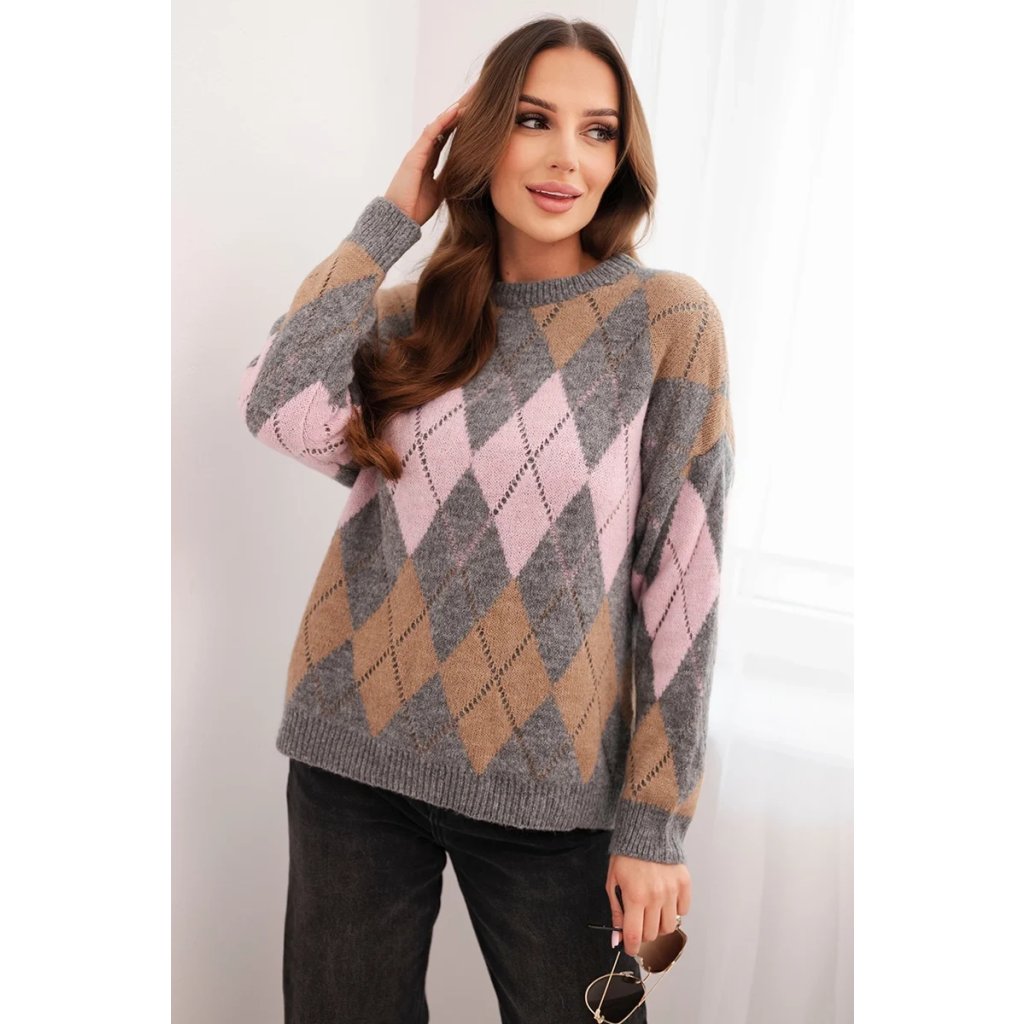Dámsky sveter s diamantovým vzorom a jemným priesvitom je ideálnou kombináciou klasiky a moderného štýlu. Vyznačuje sa geometrickým vzorom v módnych farbách a jemnými perforovanými detailmi, ktoré mu dodávajú ľahkosť a ženský charakter. Klasický, jednoduchý strih s okrúhlym výstrihom robí sveter skvele padnúcim na postavu a je vhodný pre mnoho stylizácií – ako každodenných, tak elegantnejších. Mäkký materiál s prídavkom vlny a viskózy zaisťuje pohodlie pri nosení a ochranu pred chladom. To je ideálna voľba na jeseň a zimu!