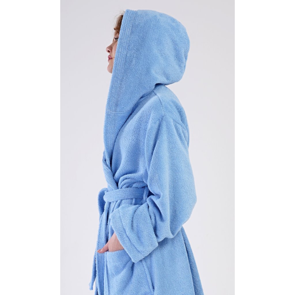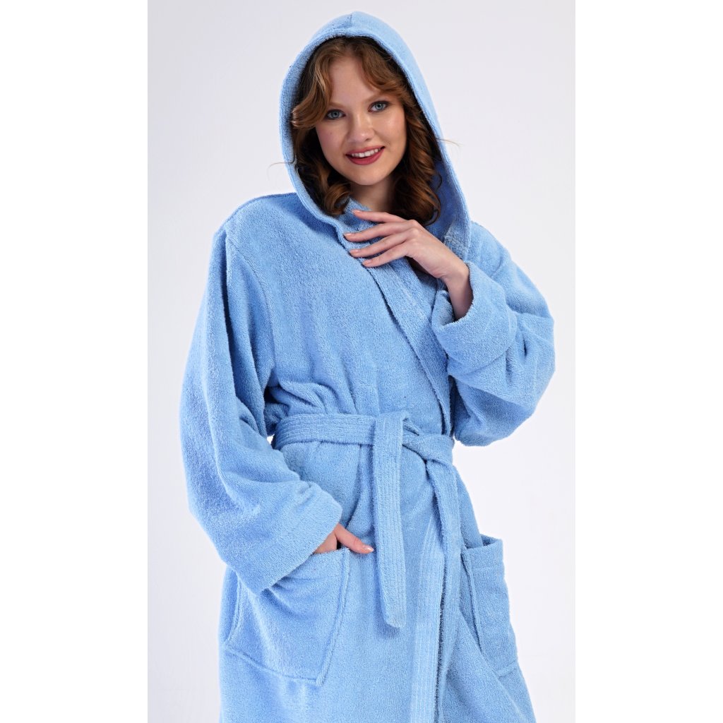 Dámsky bavlnený froté župan s kapucňou Modrý. Dámsky dlhý župan s kapucňou a sťahovacím pásom je vhodný po kúpeli aj na domáce leňošenie na gauči. Froté župan má praktické vrecká, ktoré oceníte pri návšteve kúpeľov. Použitý bavlnený materiál je príjemný a pružný na dotyk.