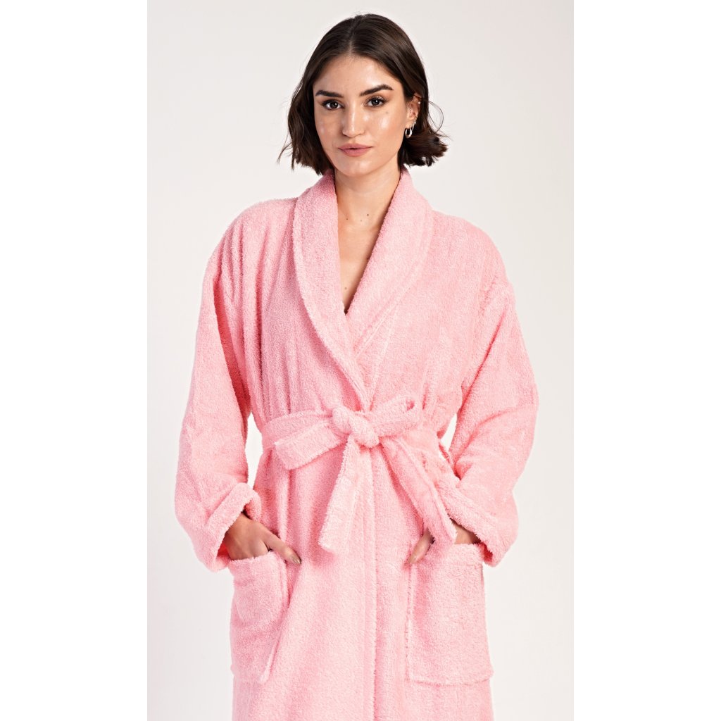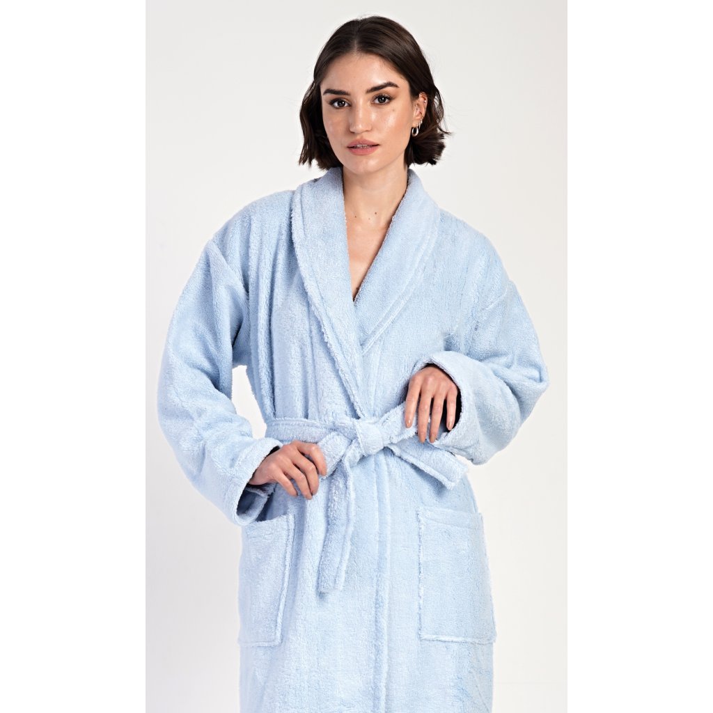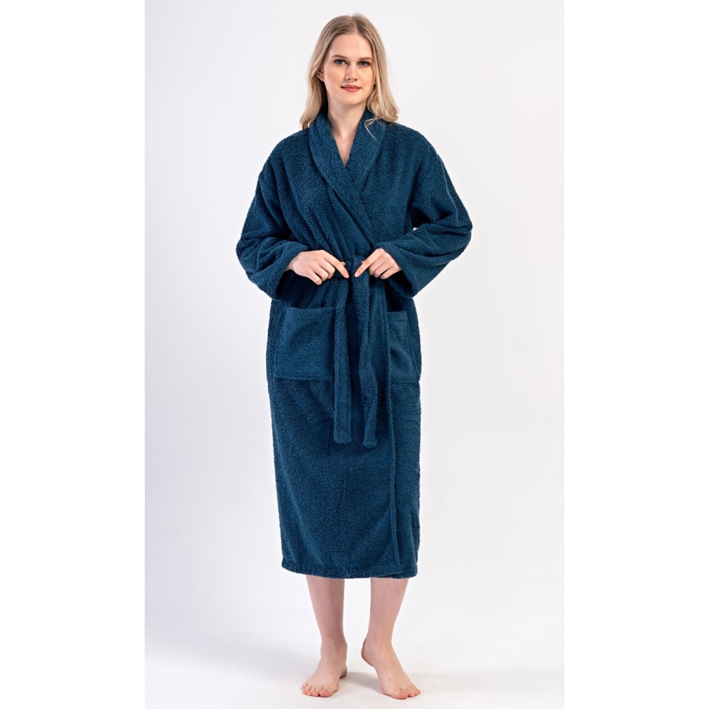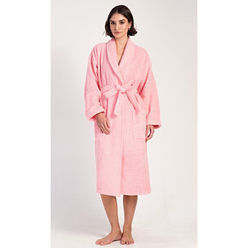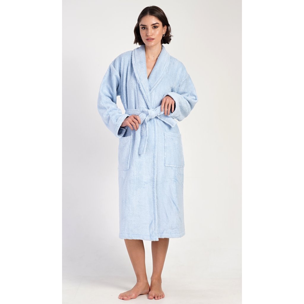 Dámsky dlhý froté župan so šálovým golierom Karolína. Dámsky dlhý župan so šálovým golierom, sťahovacím pásom a vreckami je vhodný po kúpeli alebo na domáce leňošenie na gauči. Použitý bavlnený materiál je príjemný a pružný na dotyk.