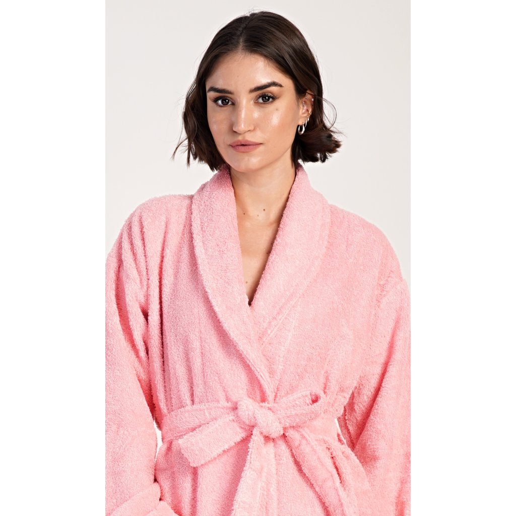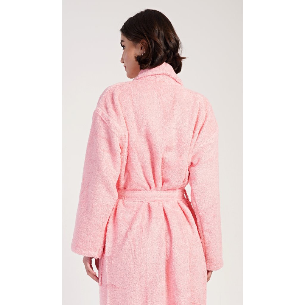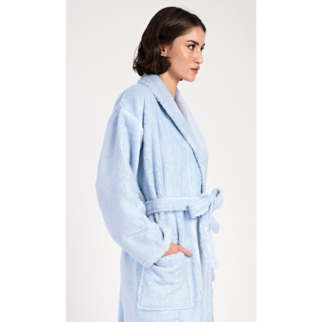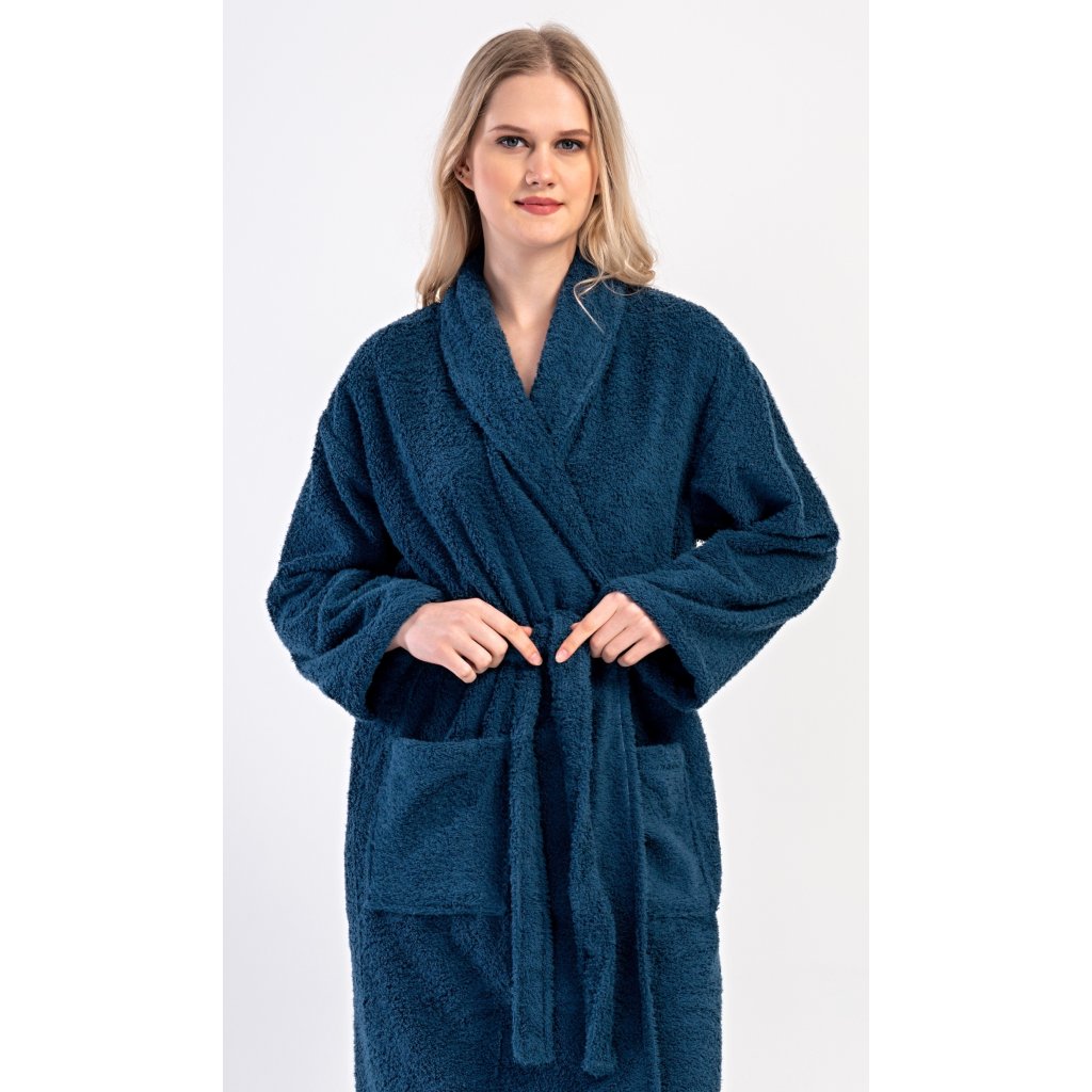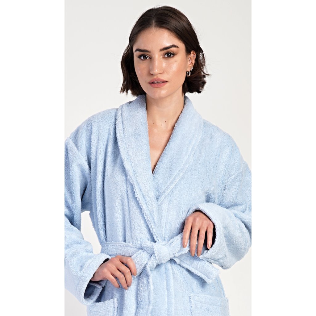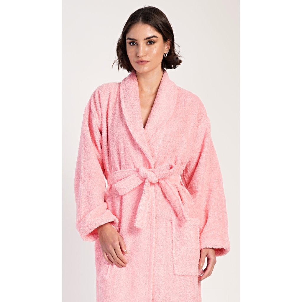 Dámsky dlhý froté župan so šálovým golierom Karolína. Dámsky dlhý župan so šálovým golierom, sťahovacím pásom a vreckami je vhodný po kúpeli alebo na domáce leňošenie na gauči. Použitý bavlnený materiál je príjemný a pružný na dotyk.