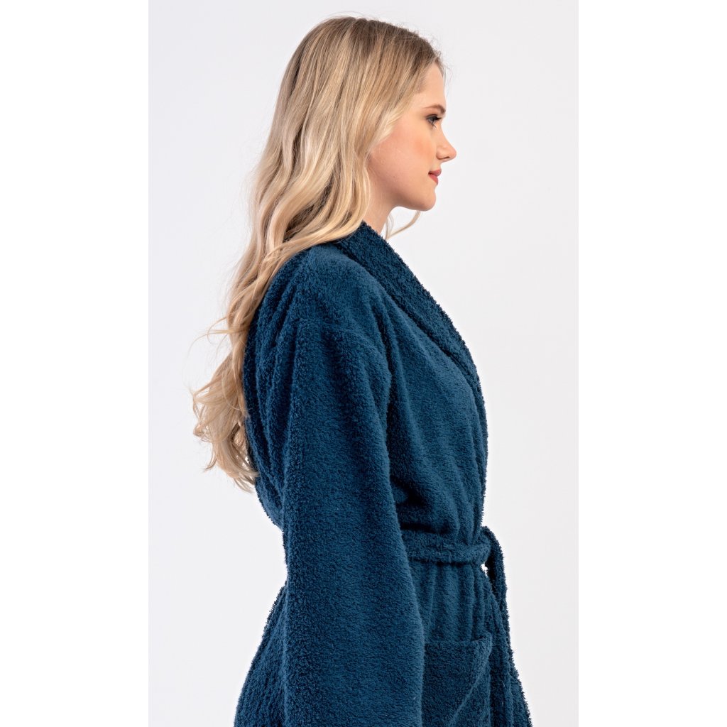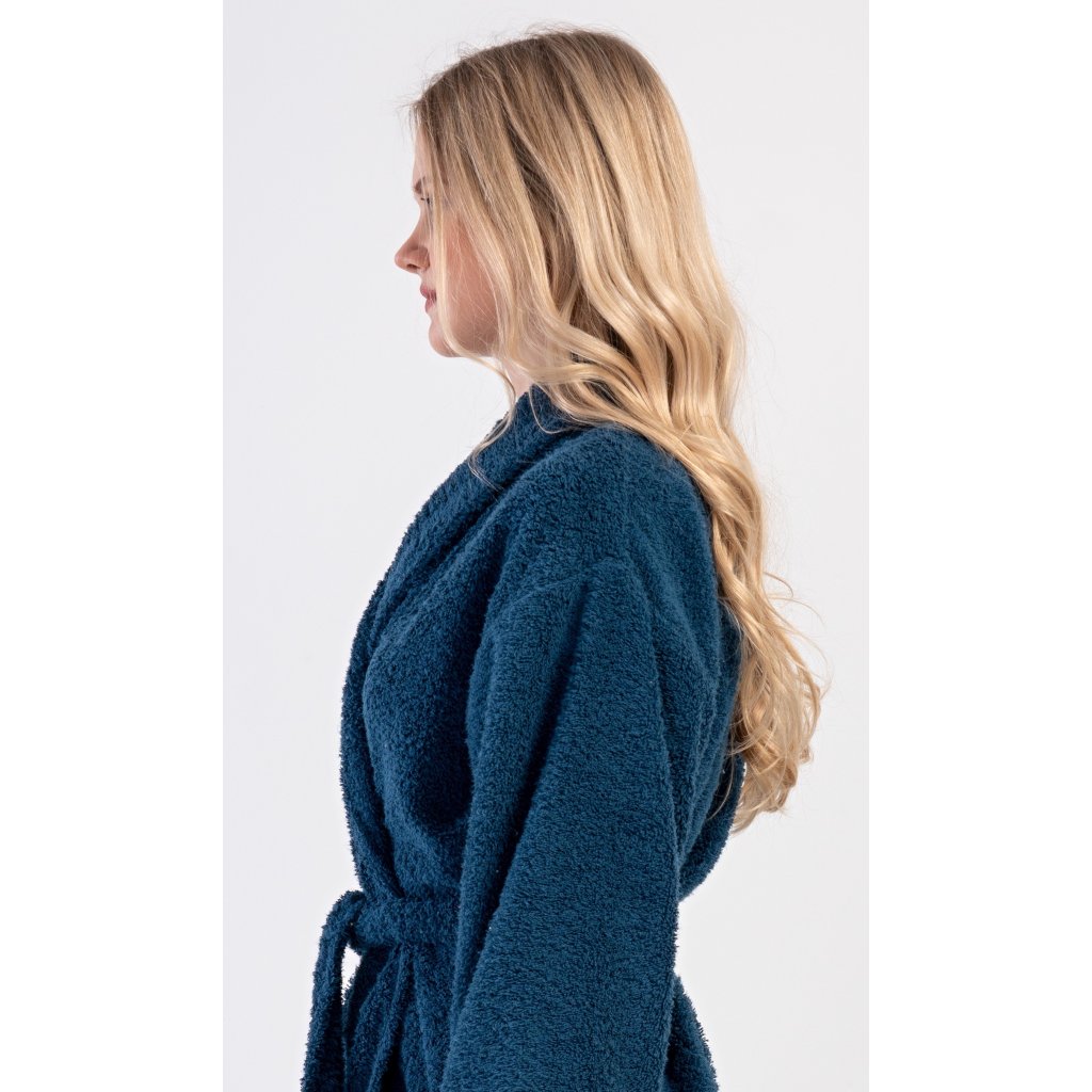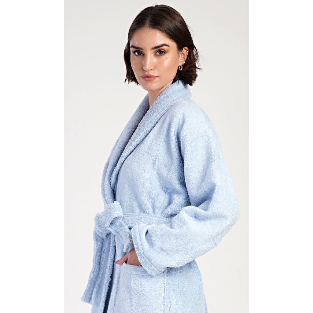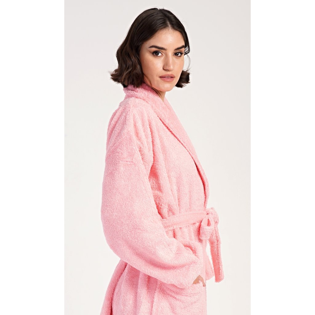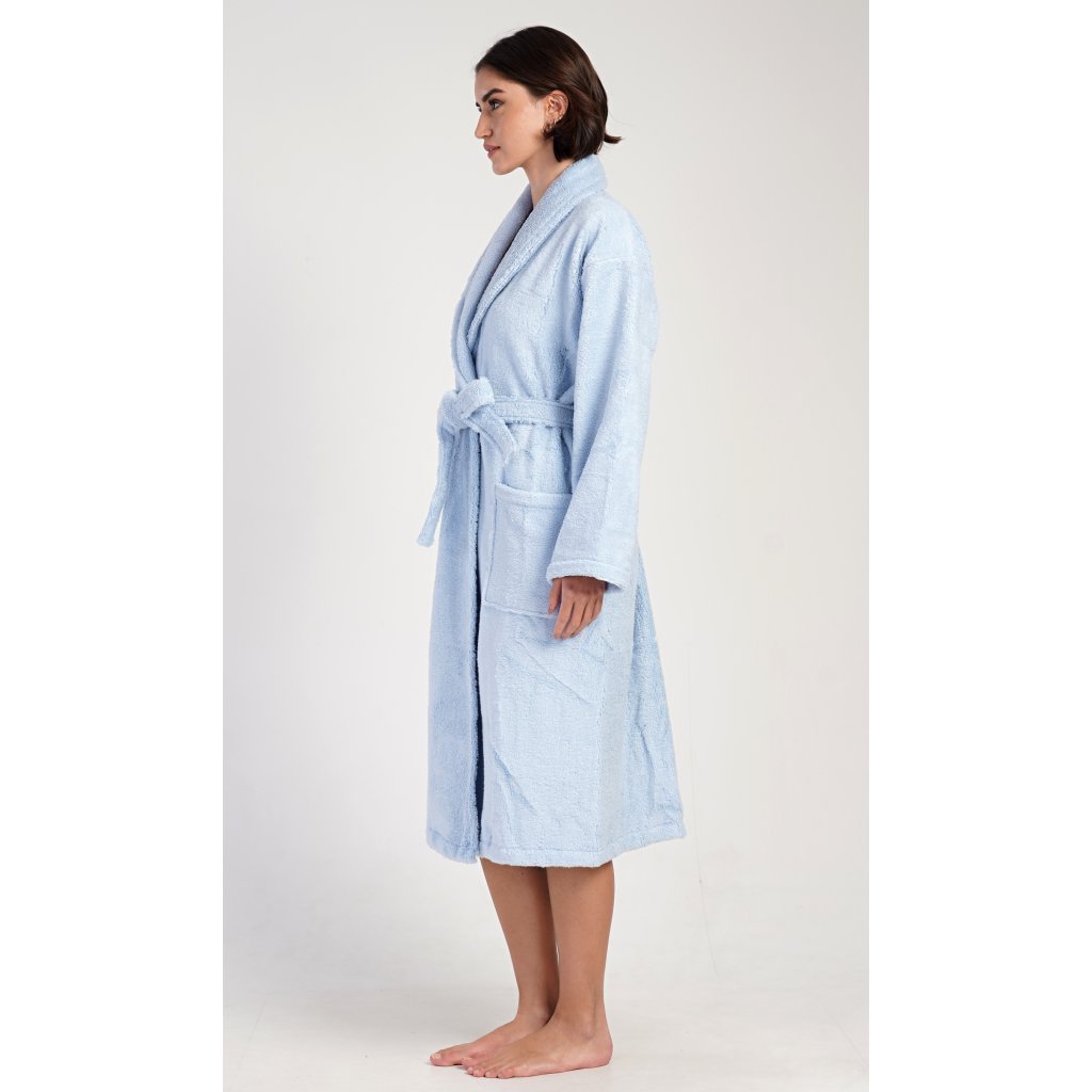 Dámsky dlhý froté župan so šálovým golierom Karolína. Dámsky dlhý župan so šálovým golierom, sťahovacím pásom a vreckami je vhodný po kúpeli alebo na domáce leňošenie na gauči. Použitý bavlnený materiál je príjemný a pružný na dotyk.
