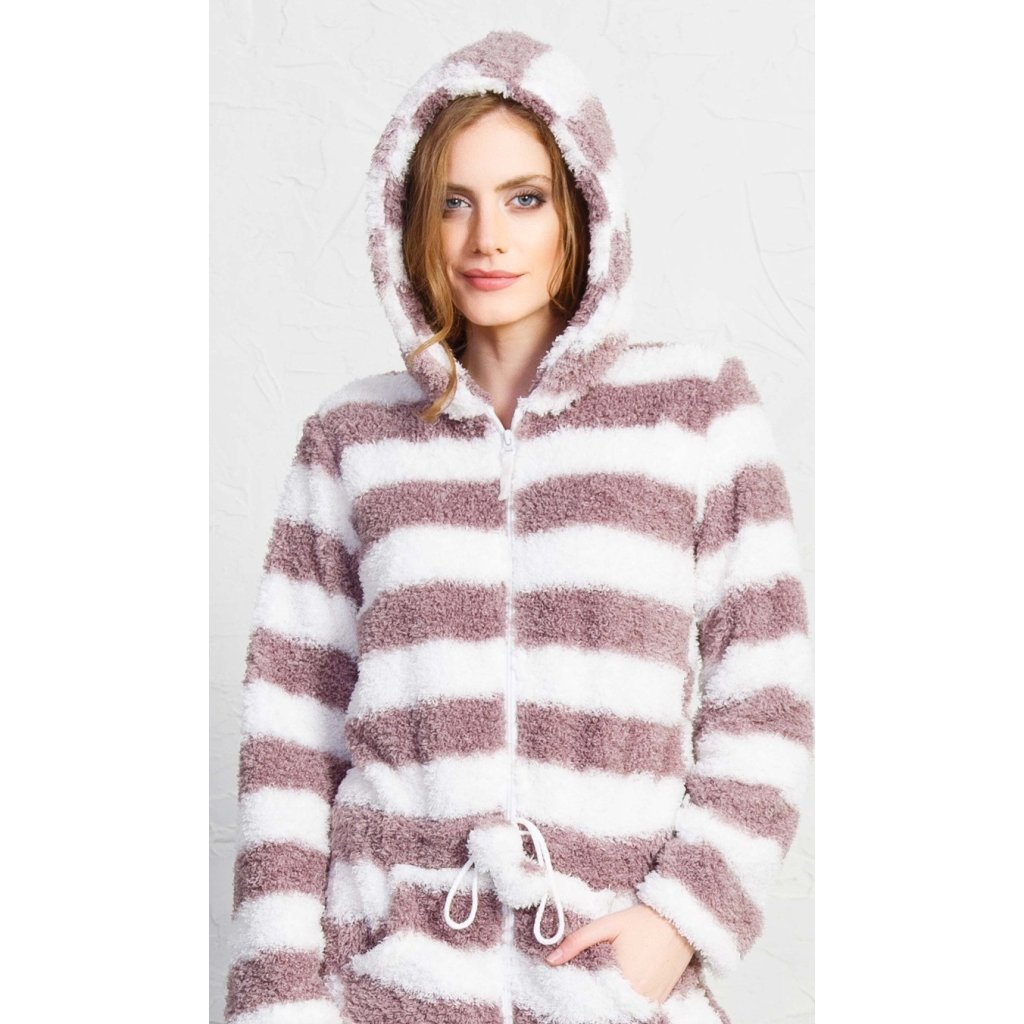 Dámsky krátky župan Eva s kapucňou, zipsom a ponožkami. Župan zdobia pruhy, zips po celej dĺžke a šnúrka na stiahnutie. Na prednej strane sú našité dve vrecká. Župan je vyrobený z mäkkého, pružného materiálu, ktorý je príjemný na dotyk.