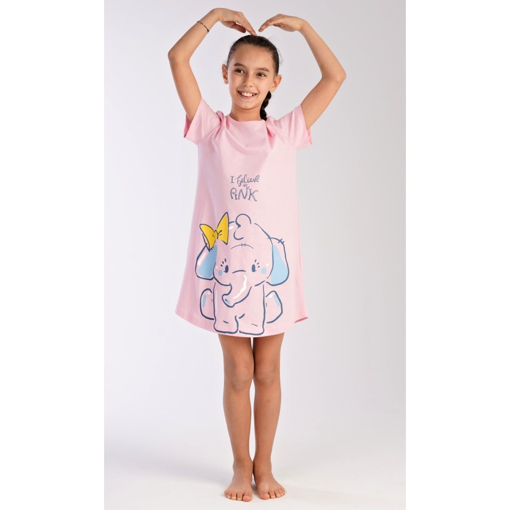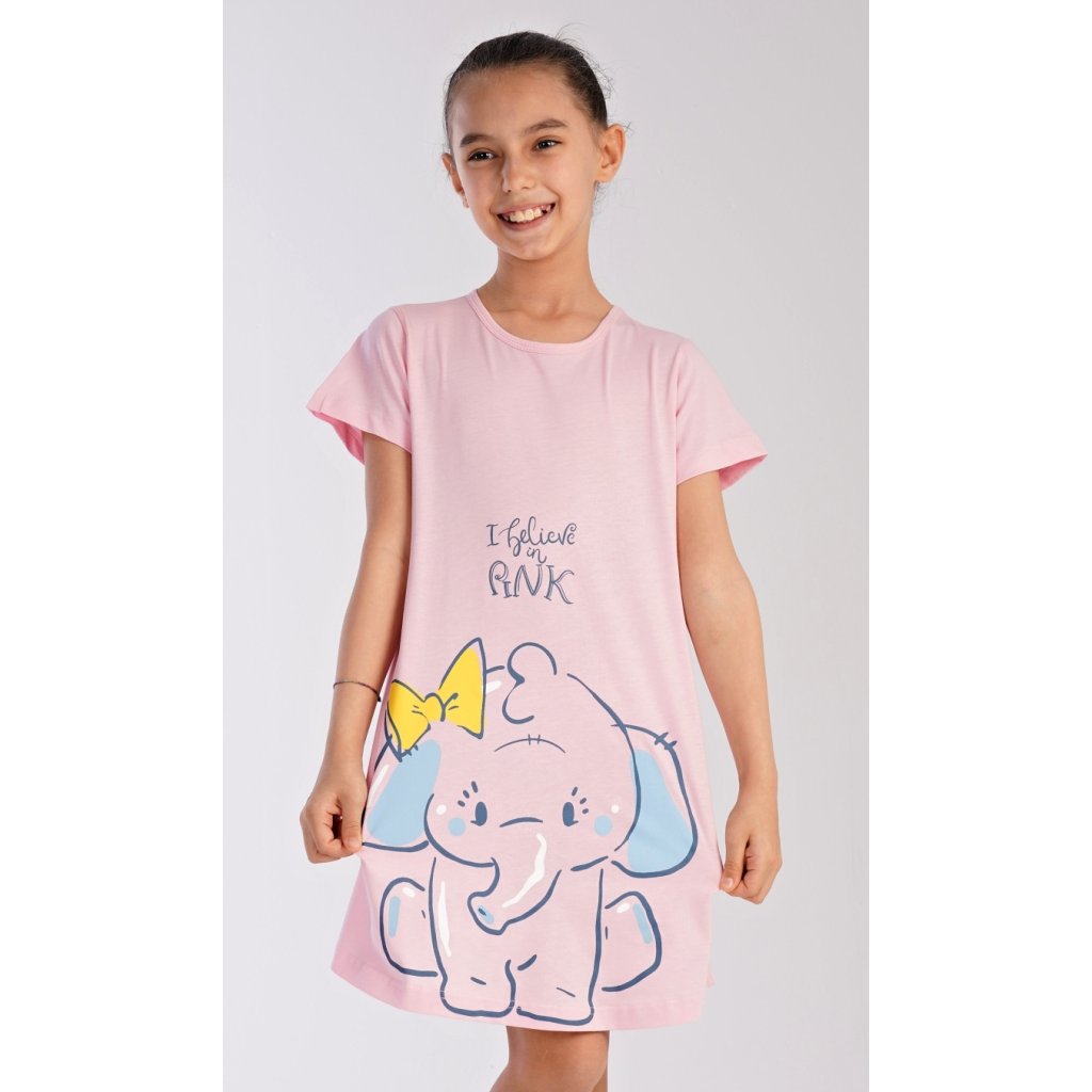 Detská bavlnená nočná košeľa s krátkym rukávom Slon. Jednofarebné tričko s krátkymi rukávmi obsahuje obrázok slona a nápis "I believe pink". Použitý bavlnený materiál je pružný a mäkký na dotyk.