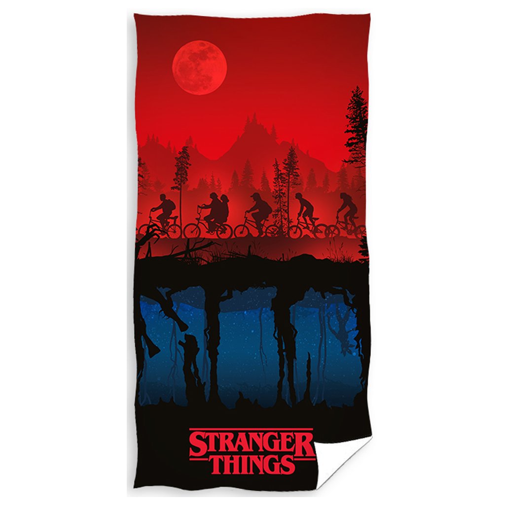 Na spodnej strane uteráka je paralelný svet a na vrchu uteráka je červený nápis Stranger Things
