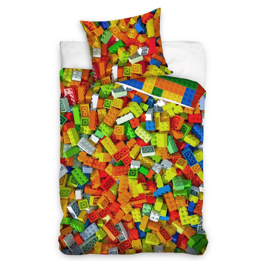 Lícna strana detských obliečok je plná farebných kociek, ktoré sú systematicky poskladané a tvoria celistvú plochu