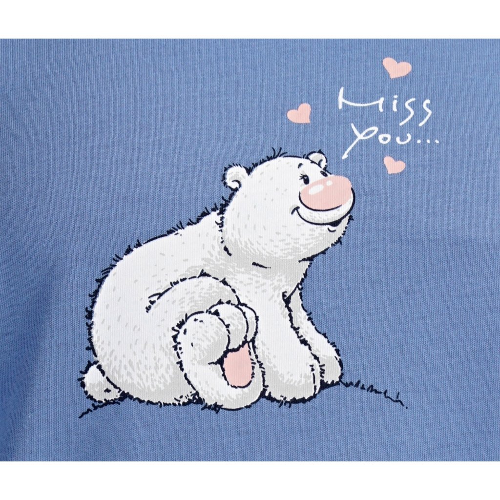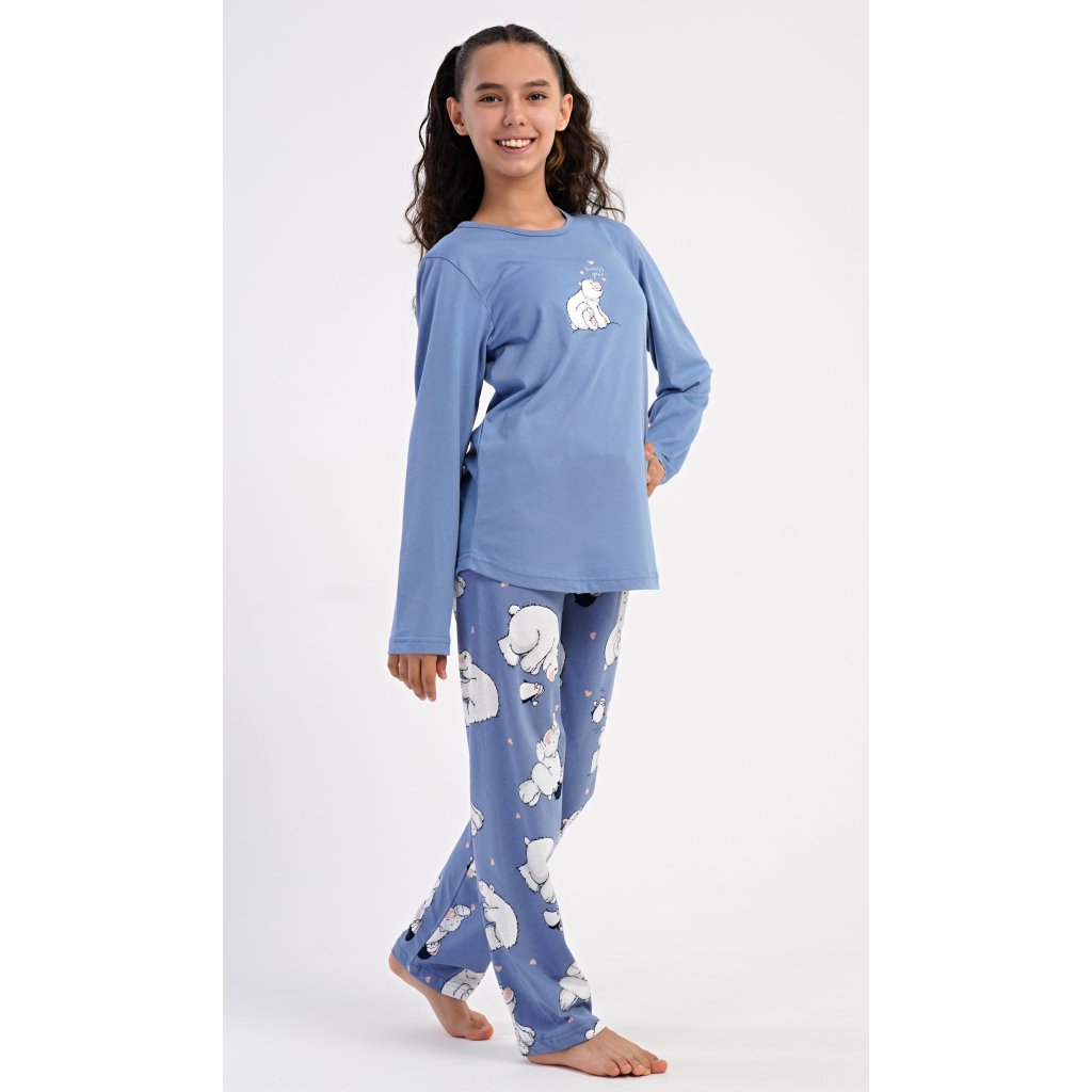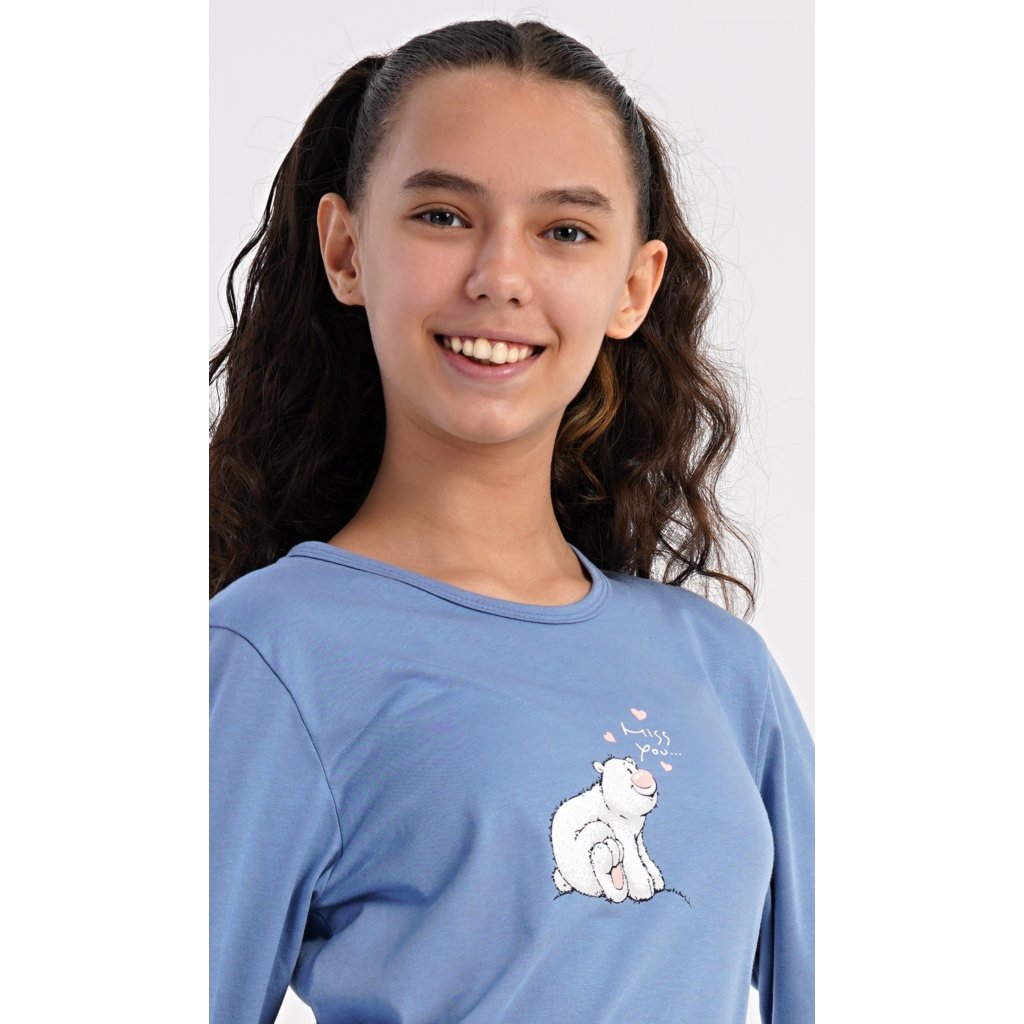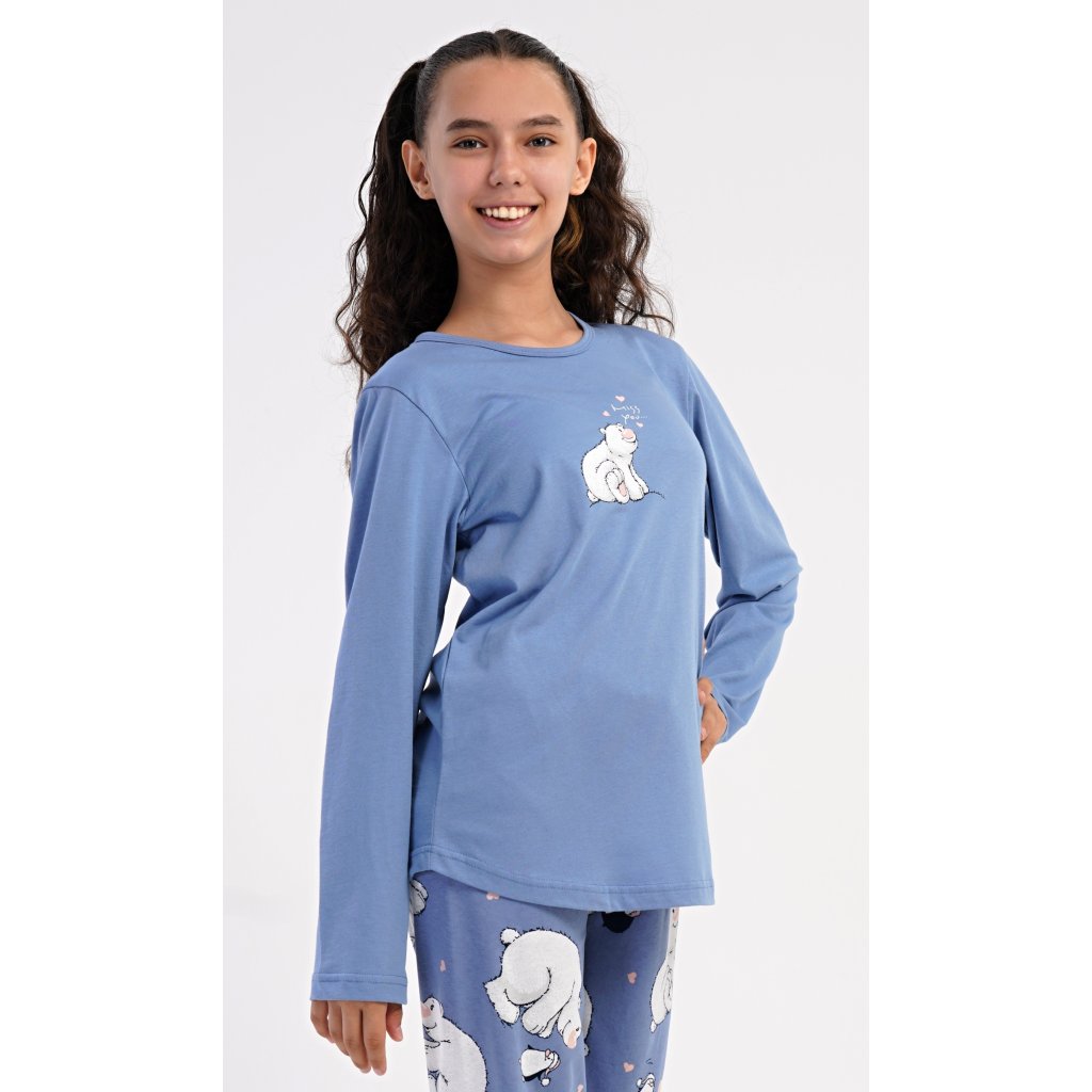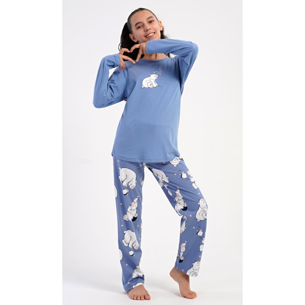 Detské bavlnené dlhé pyžamo Méďa a tučniak. Dievčenské pyžamo sa skladá z trička s dlhým rukávom a dlhých nohavíc. Tričko s okrúhlym výstrihom je ozdobené obrázkom ľadového medveďa. Tento motív sa opakuje aj na nohaviciach, ktoré majú elastický pás a šnúrku, ale nemajú vrecká. Použitý bavlnený materiál je pružný a príjemný na dotyk.