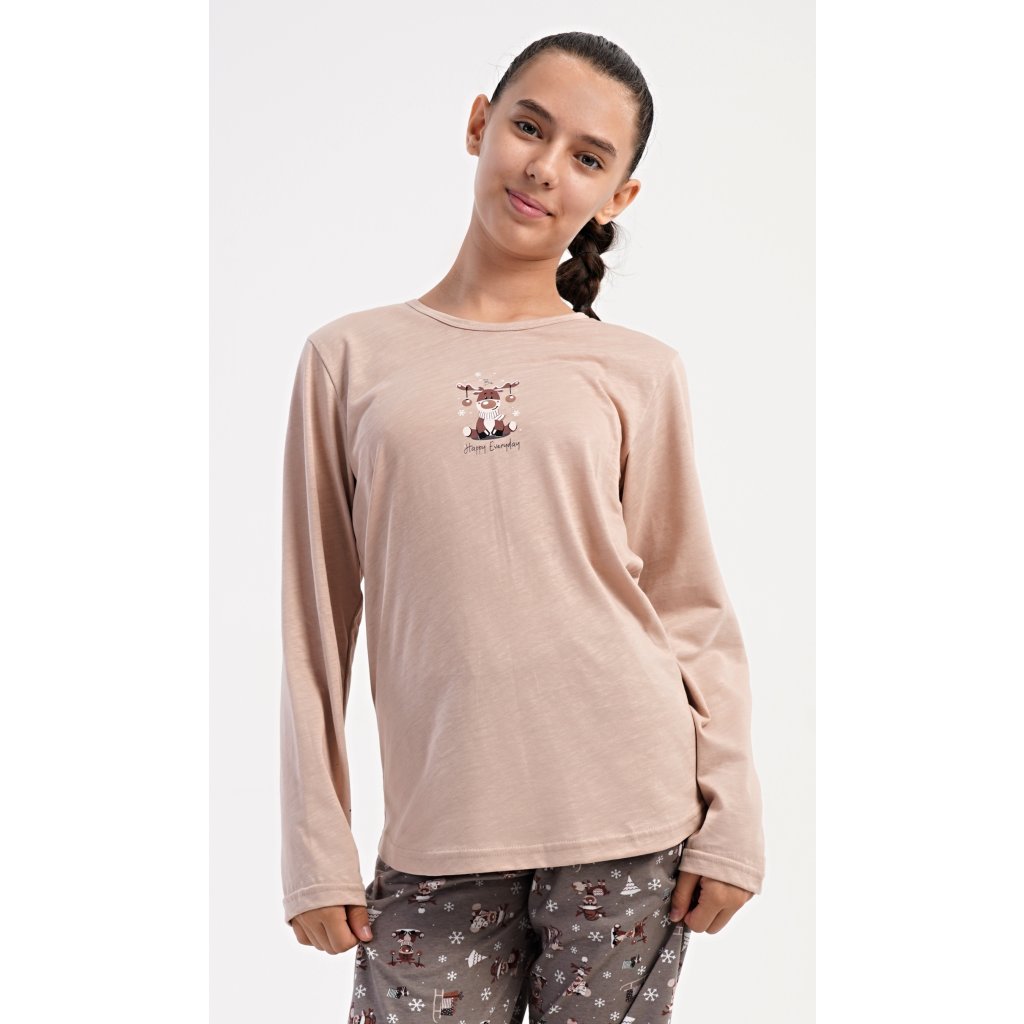 Detské bavlnené dlhé pyžamo Sobík. Dievčenské pyžamo sa skladá z trička s dlhým rukávom a dlhých nohavíc. Tričko s okrúhlym výstrihom je ozdobené obrázkom malého vianočného soba. Tento motív sa opakuje aj na nohaviciach, ktoré majú elastický pás a šnúrku, ale nemajú vrecká. Použitý bavlnený materiál je pružný a príjemný na dotyk.