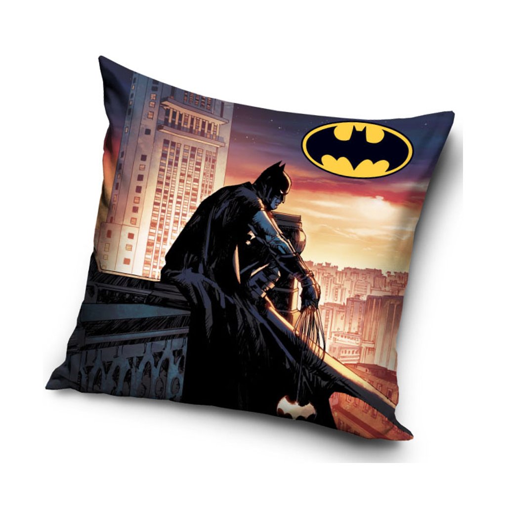 Na oboch stranách vankúšika je rovnaký motív Batmana sediaceho na streche mesta Gotham pri západe slnka