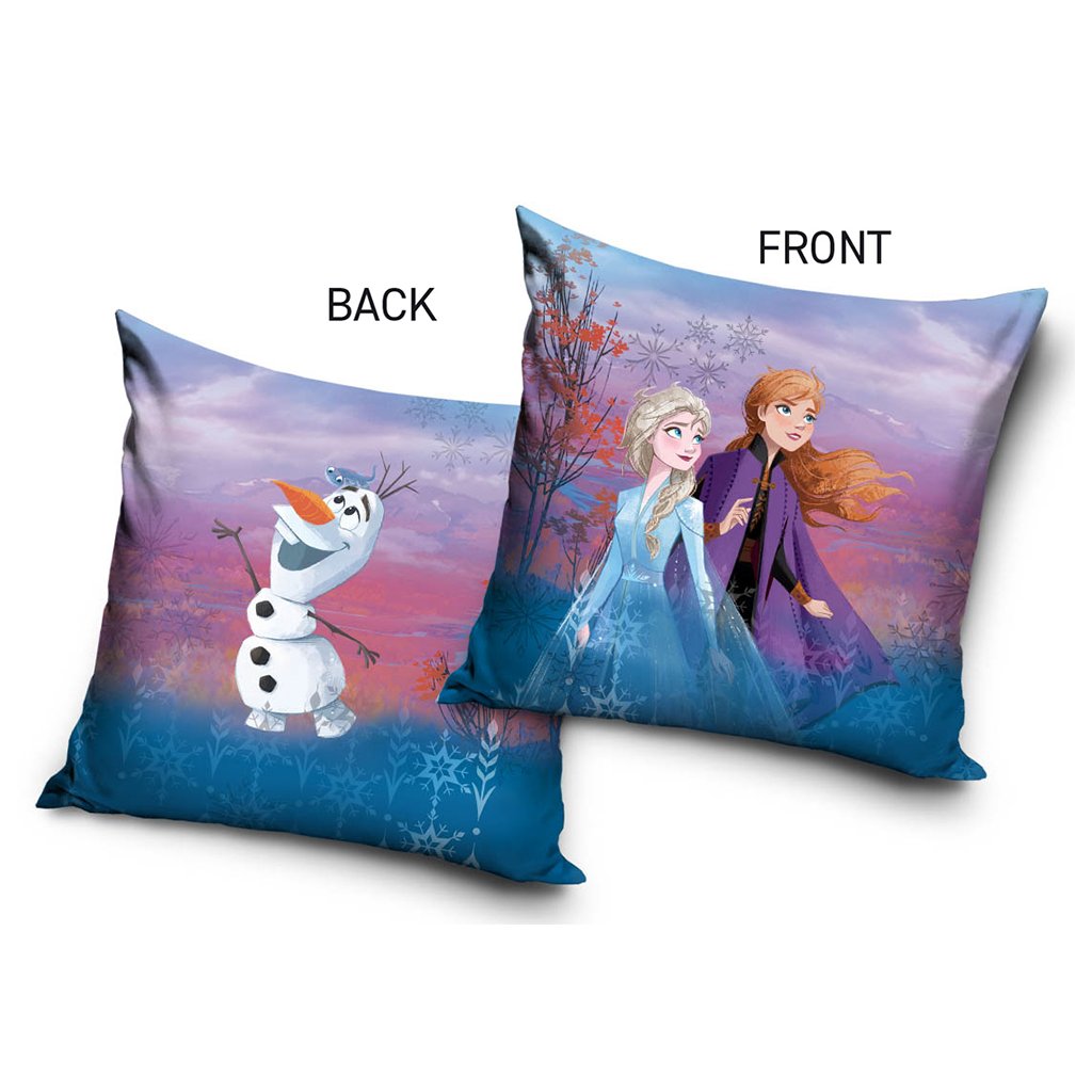 Na prednej strane vankúša sú princezné Anna a Elsa, ktoré spoločne objavujú tajomstvo zakliateho lesa