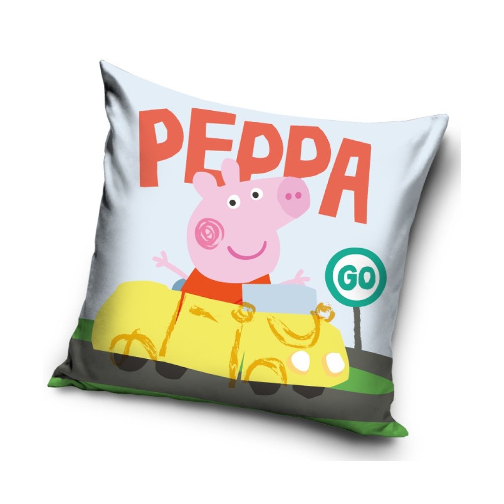 Detský vankúš Pepina Prasiatko v žltom aute je vyrobený z 100 % polyester