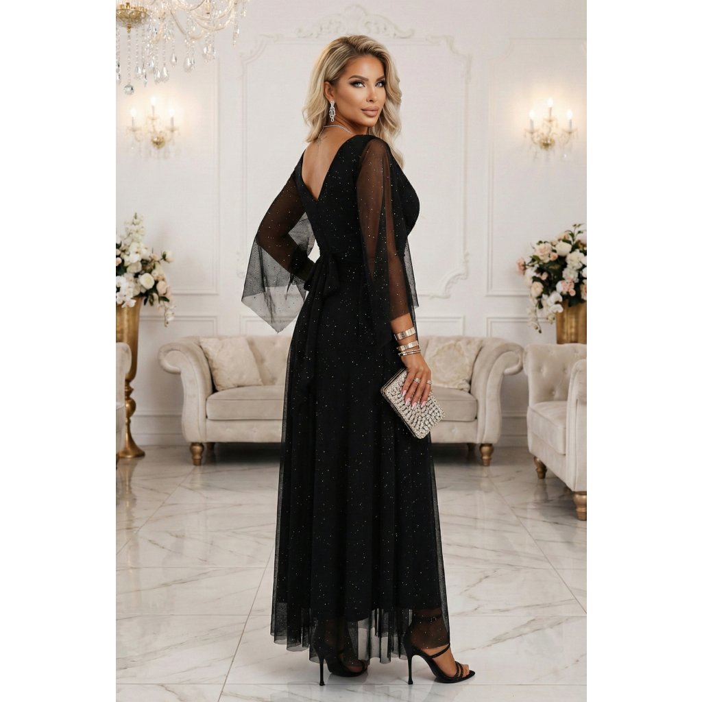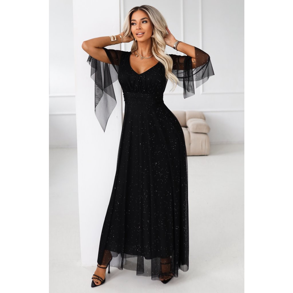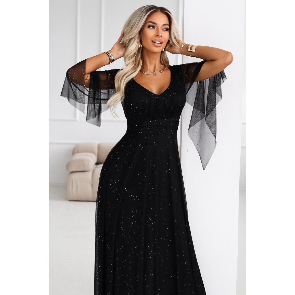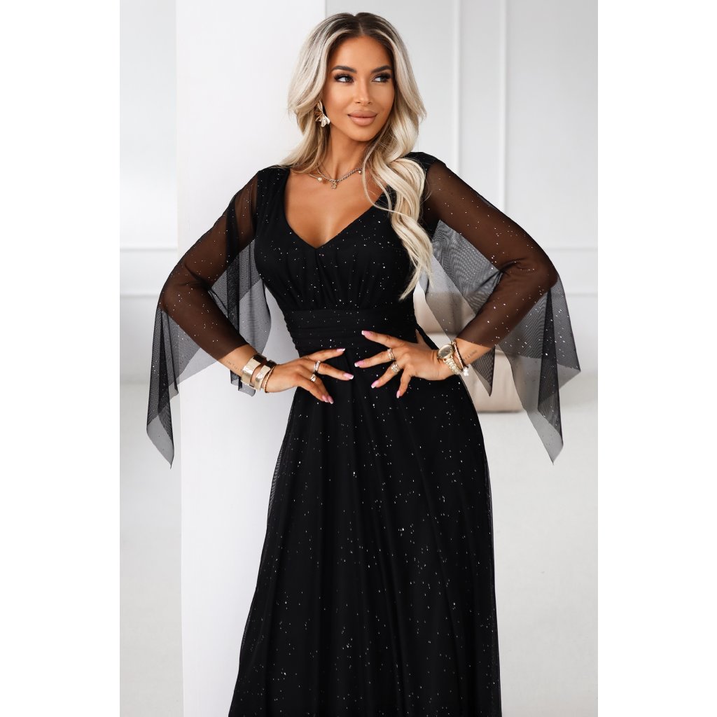 Numoco Dlhé, trblietavé šaty s výstrihom a priehľadnými rukávmi - čierne 655-1