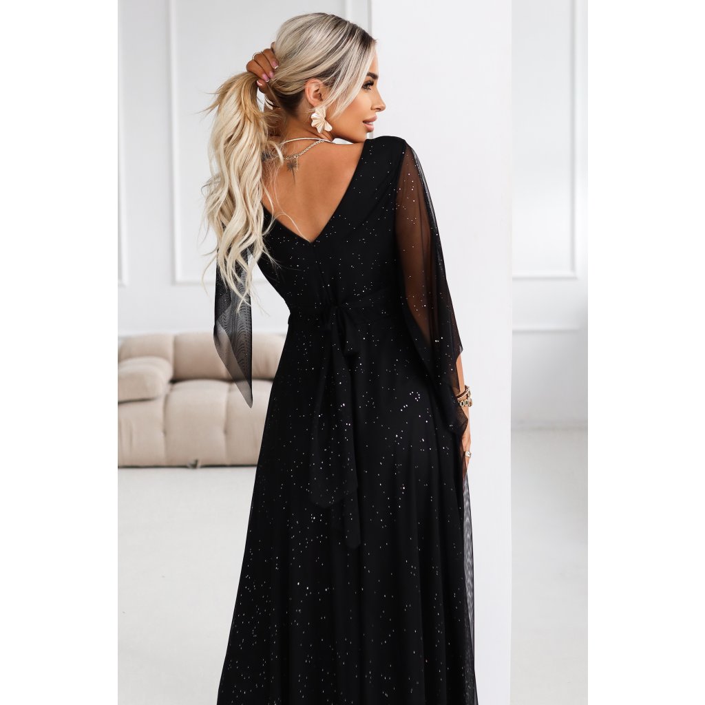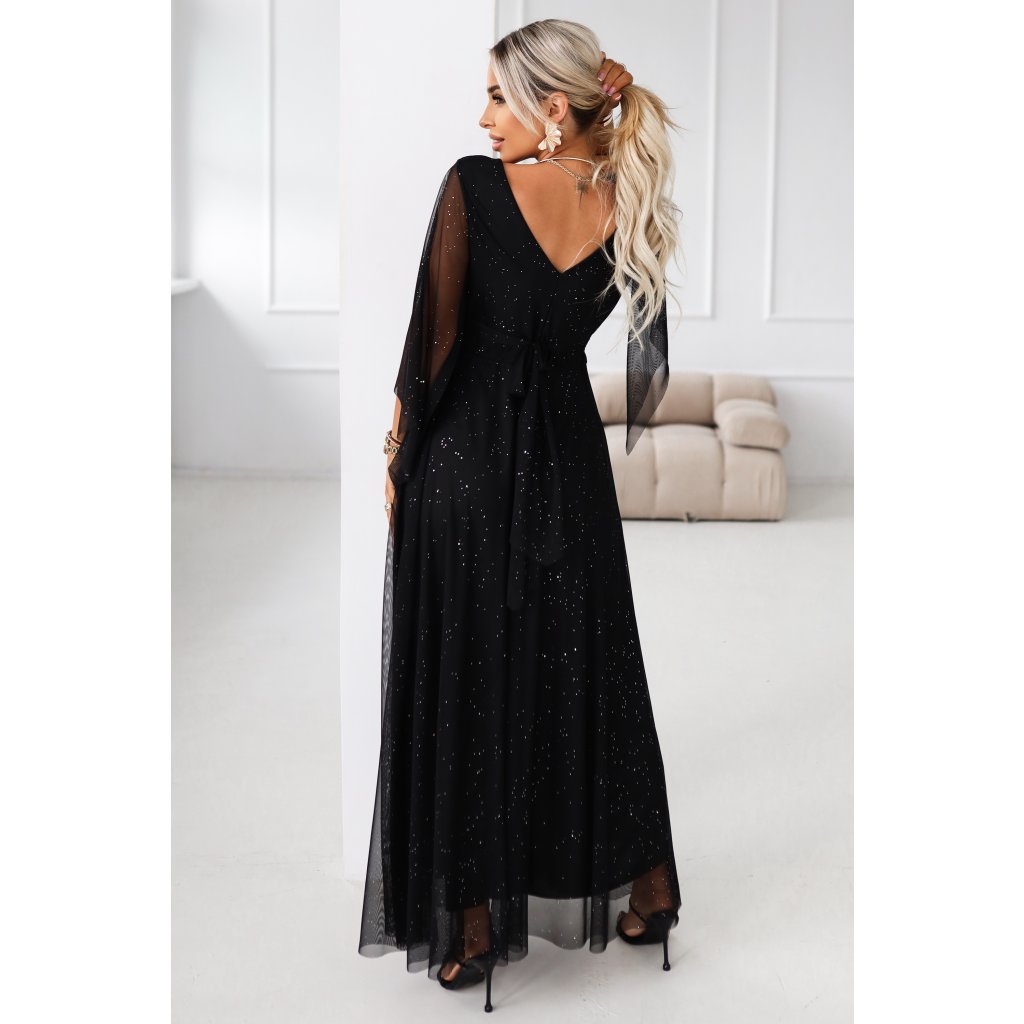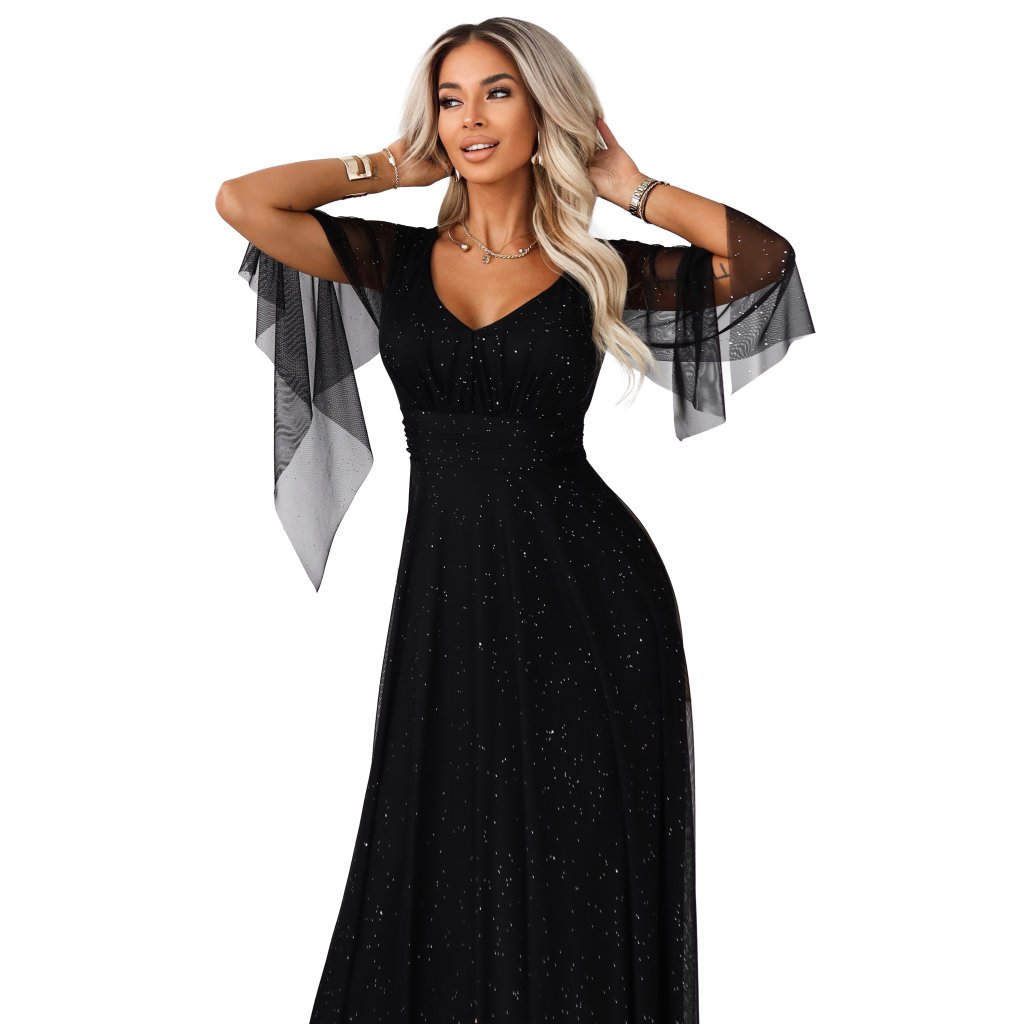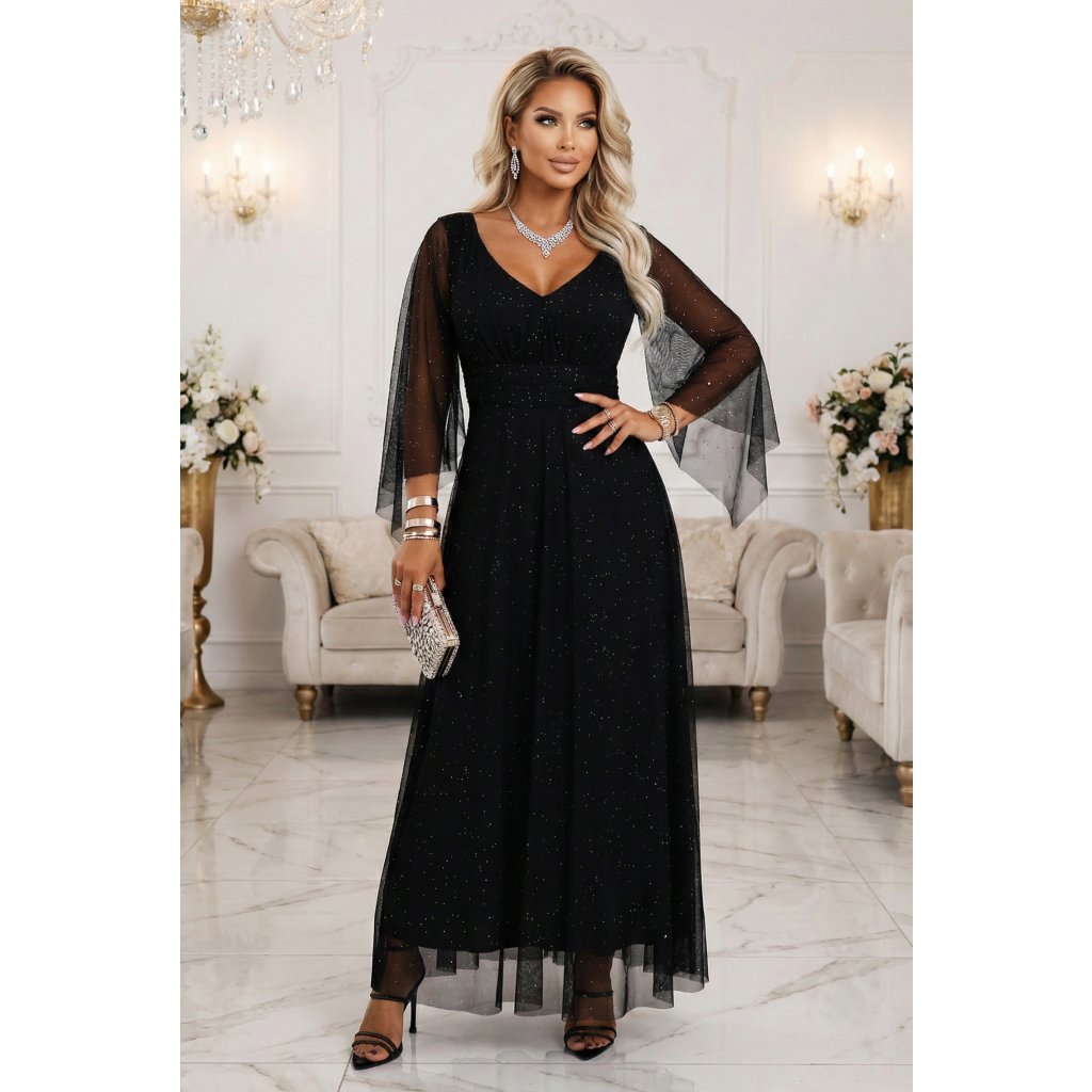 Numoco Dlhé, trblietavé šaty s výstrihom a priehľadnými rukávmi - čierne 655-1