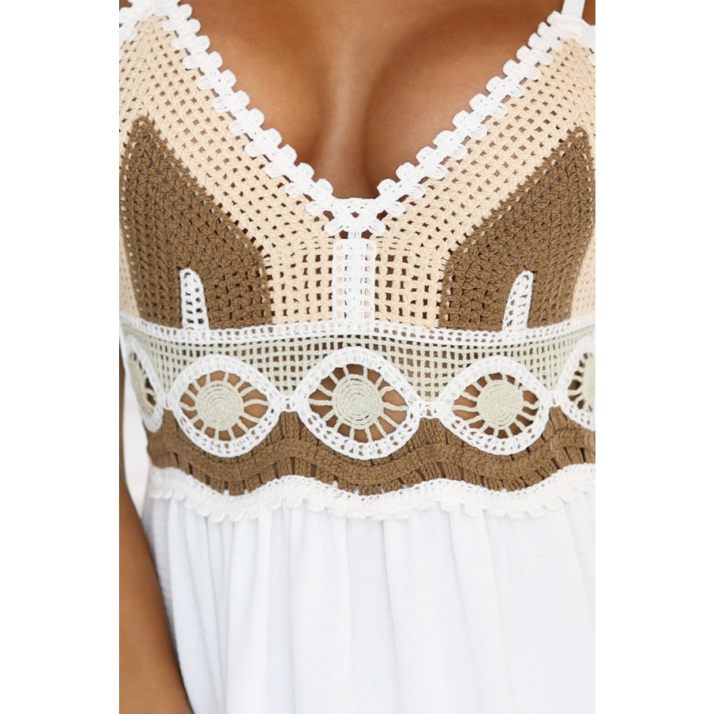 Štýlové a ženské maxi šaty v módnom boho štýle z kolekcie Numoco Basic sú ideálny návrh na leto, dovolenku a každodenné vychádzky. Vrch vyrobený z dekoratívneho háčkovaného úpletu v béžových a bielych odtieňoch jemne zdôrazňuje siluetu, zatiaľ čo tenké ramienka dodávajú ľahkosť a romantický charakter.