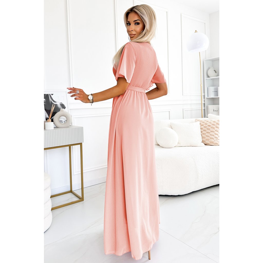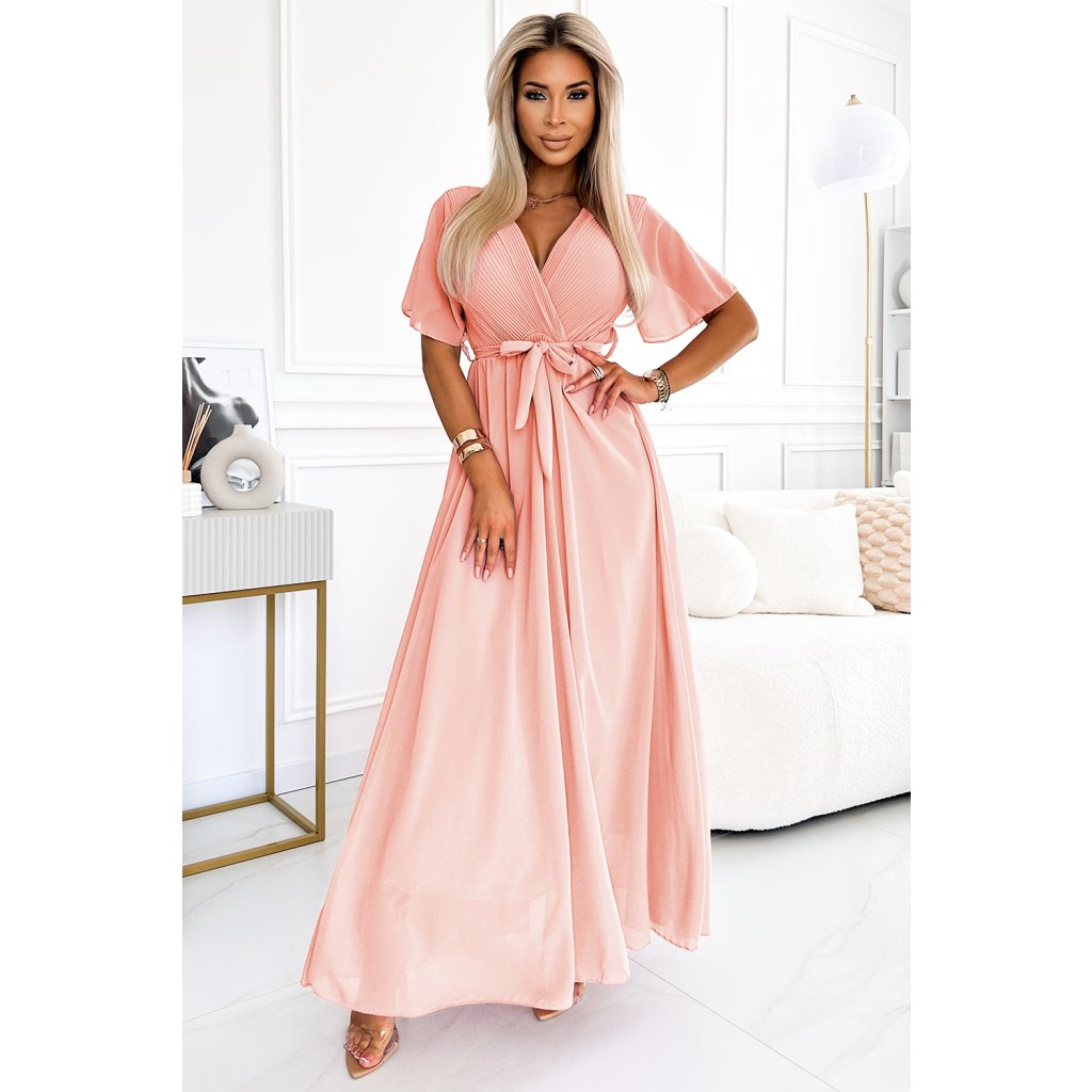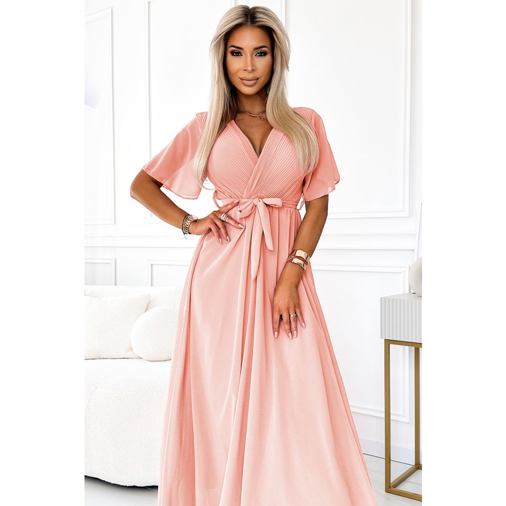 Dlhé šaty s plisovaným výstrihom a zaväzovaním - broskyňová farba 545-4