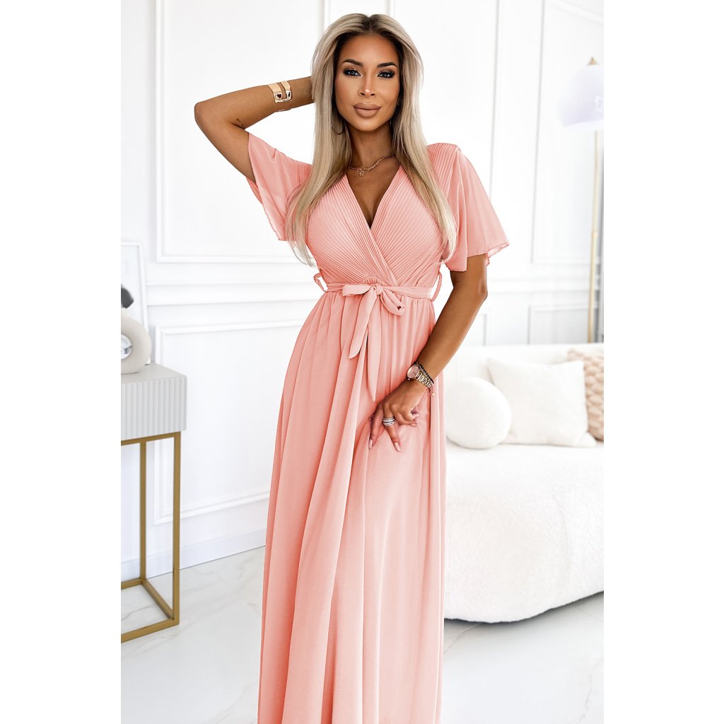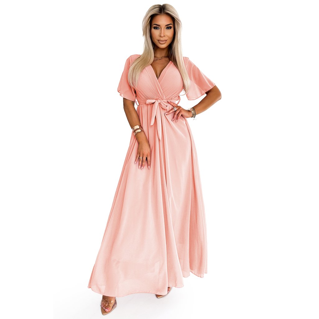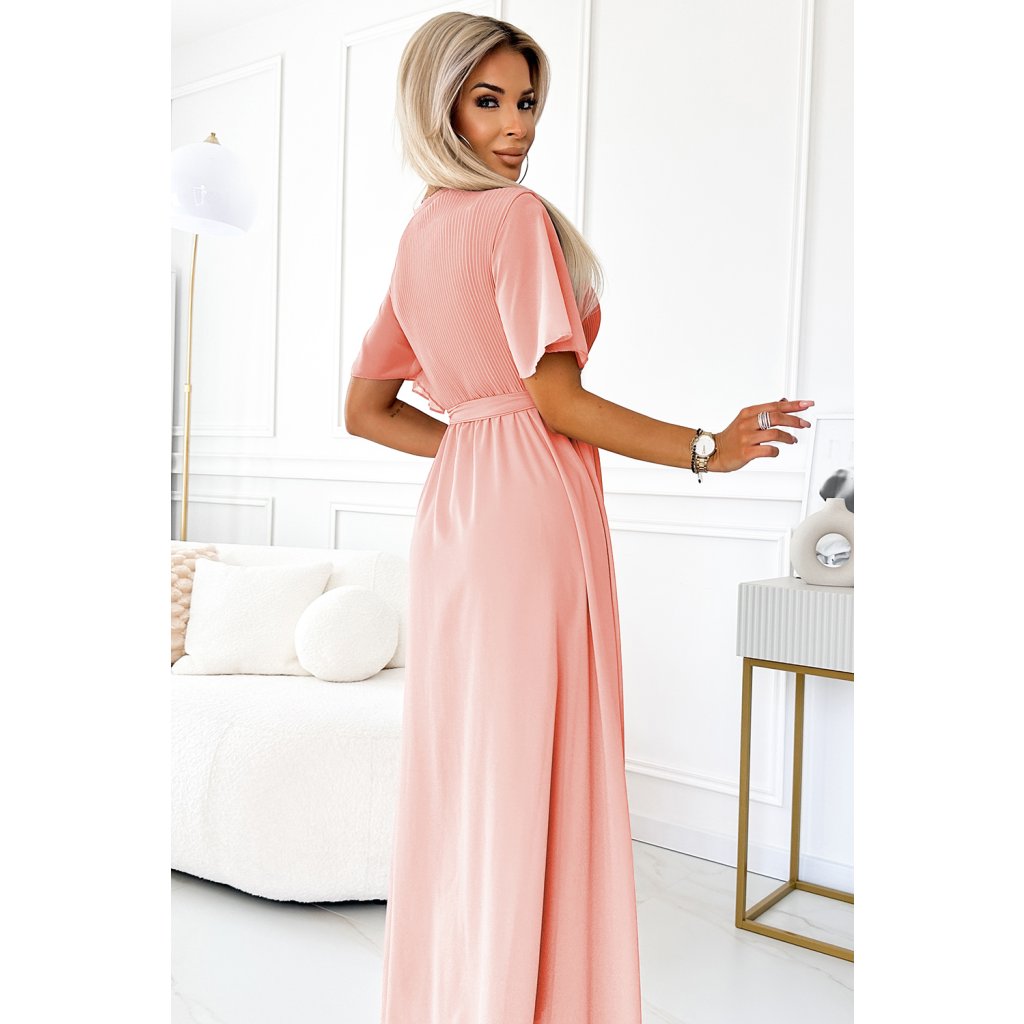 Dlhé šaty s plisovaným výstrihom a zaväzovaním - broskyňová farba 545-4