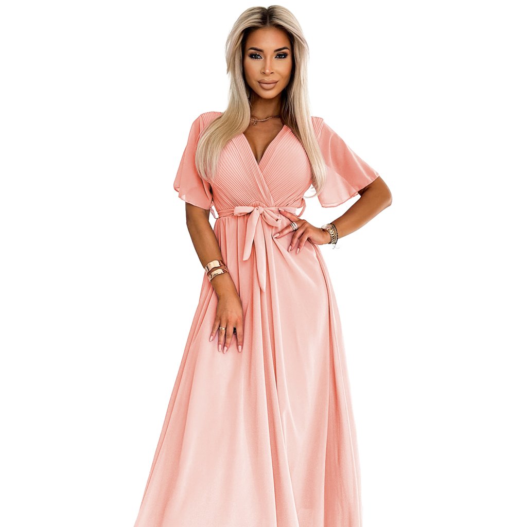 Elegantné broskyňové maxi šaty s výstrihom do V, ľahkými rukávmi a zaväzovaním v páse. Vzdušné, ženské a ideálne na svadbu, sväté prijímanie alebo večierok. Značka: Numoco Basic | Európsky produkt
