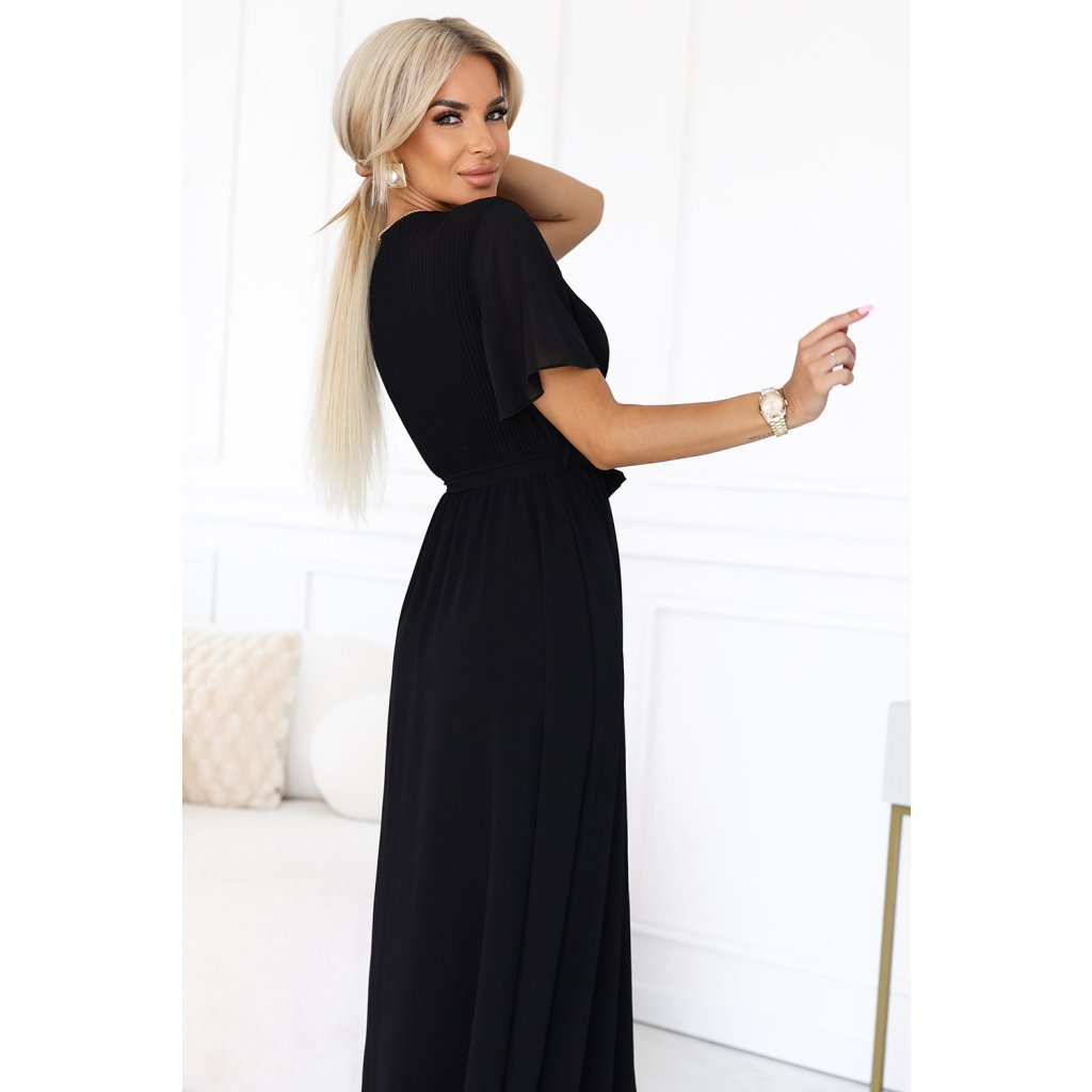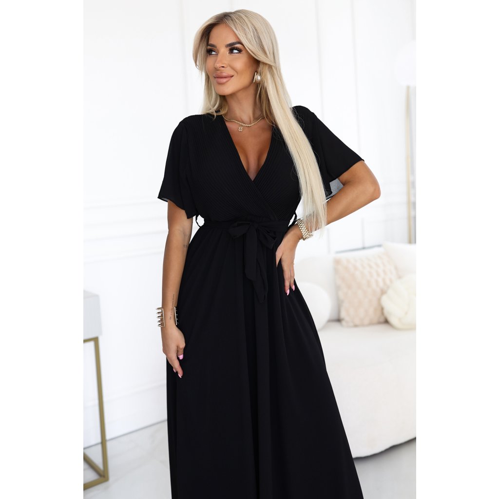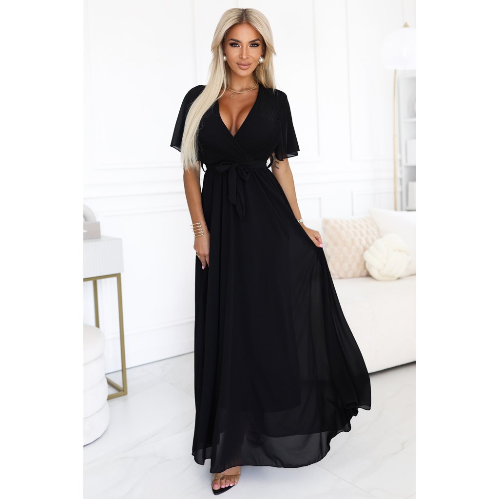 Čierne dlhé šaty s plisovaným výstrihom – Numoco Basic