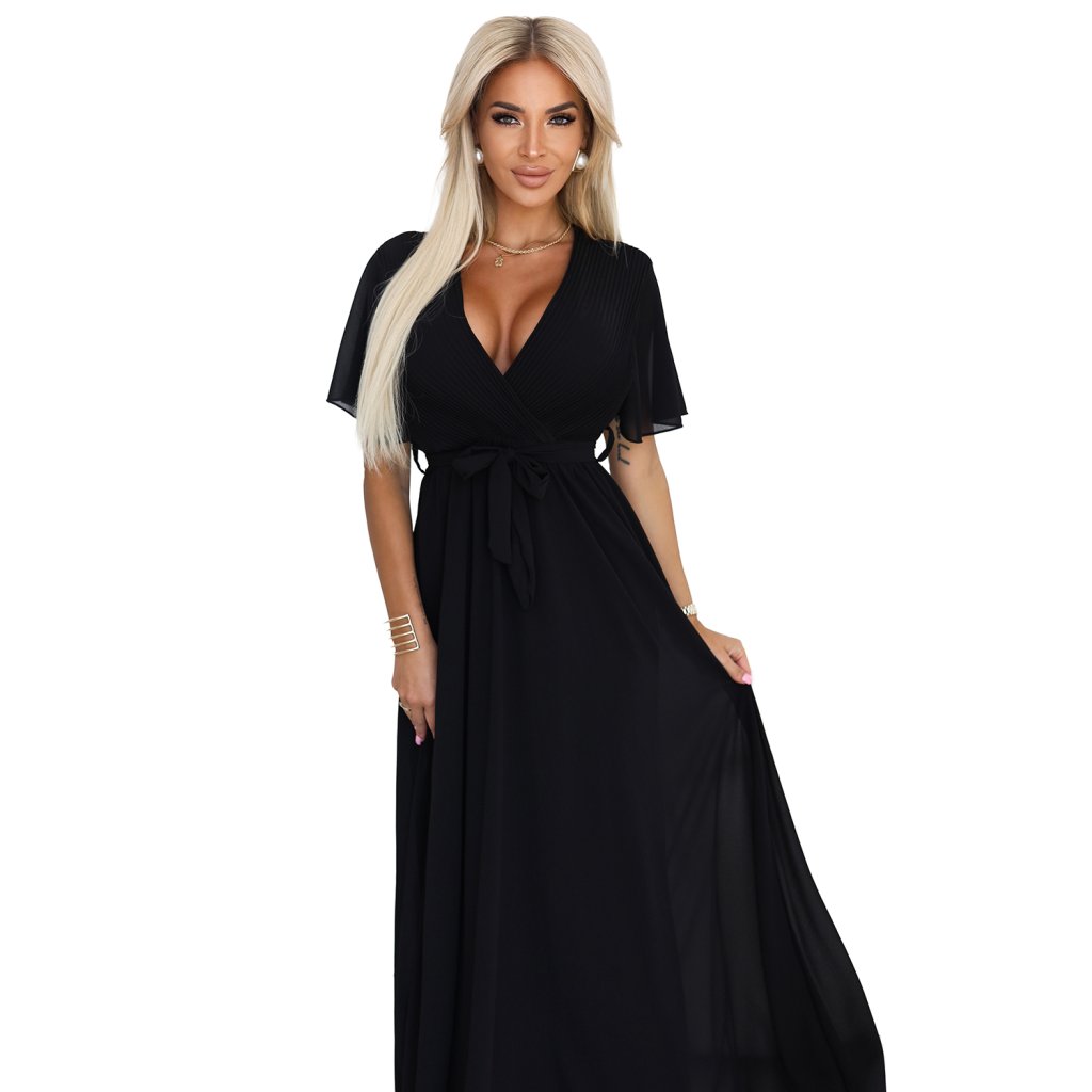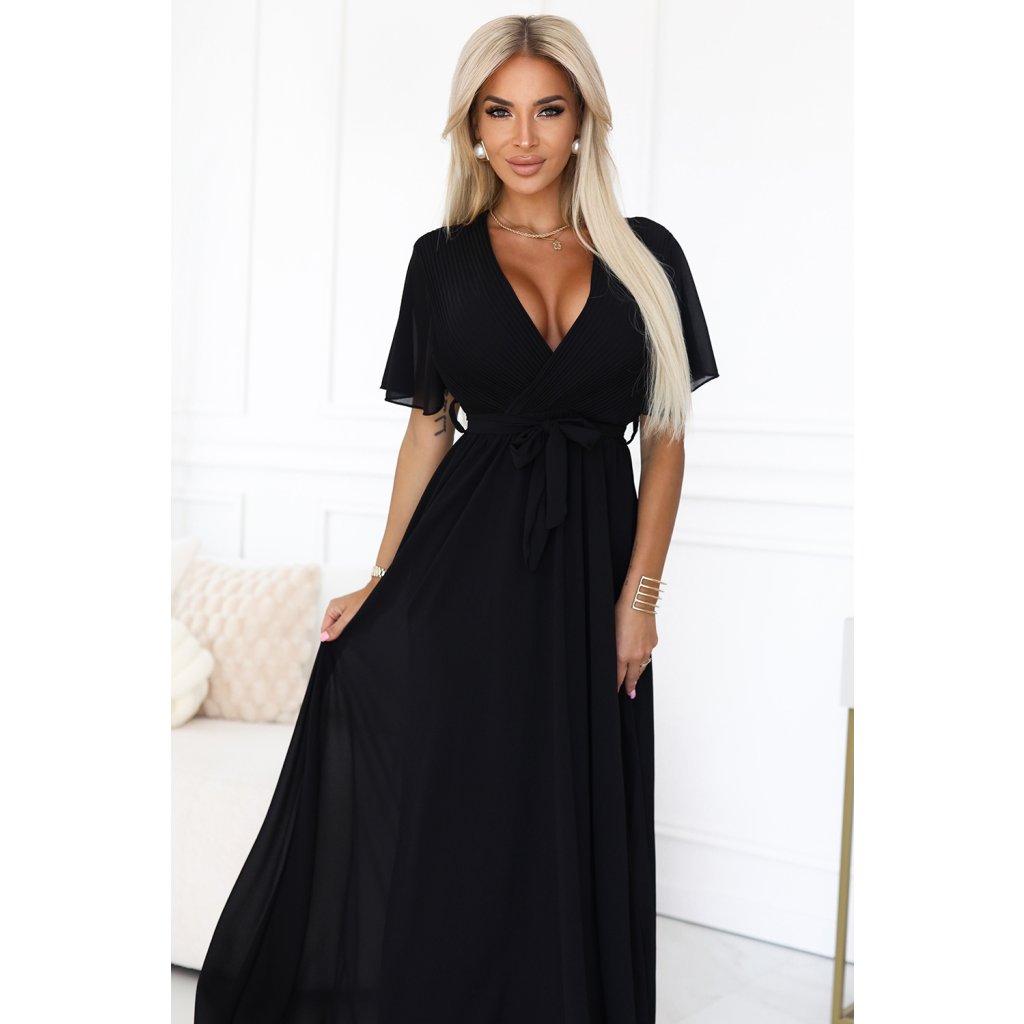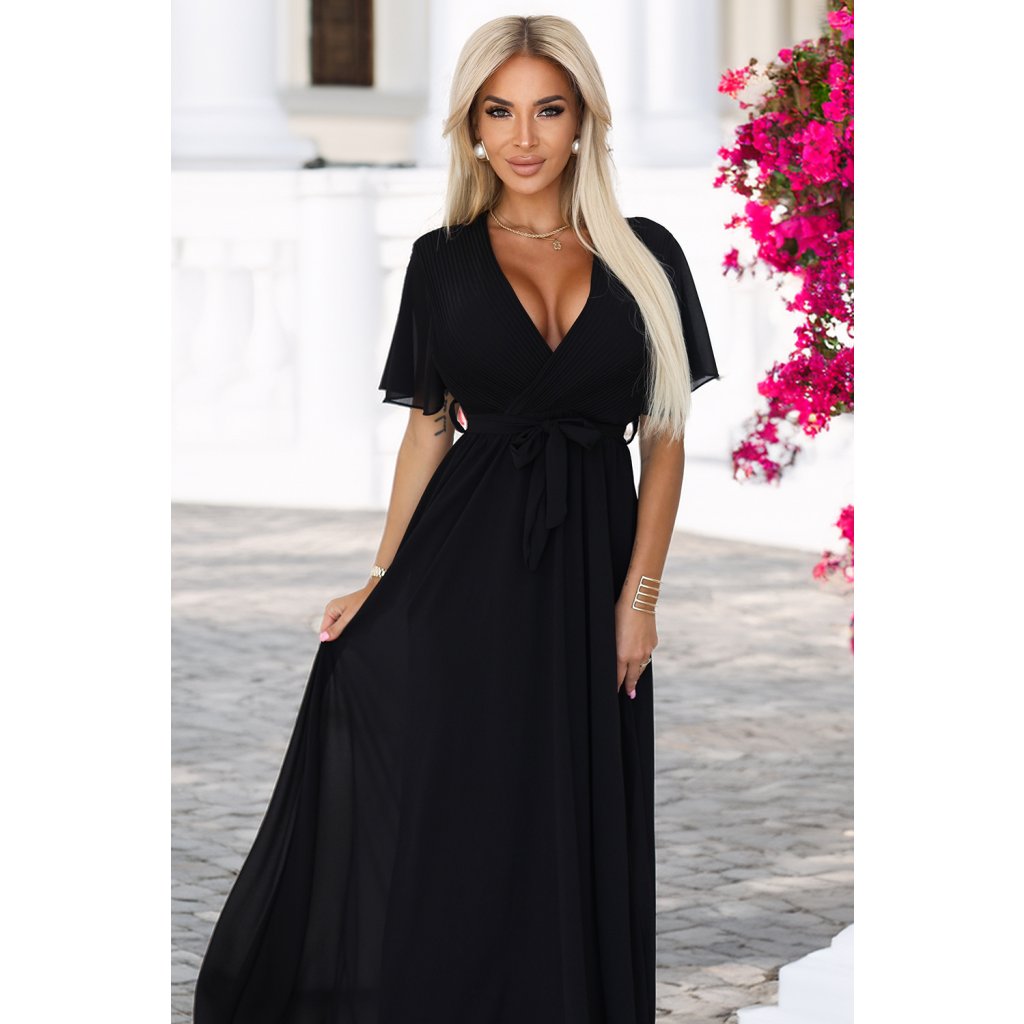 Čierne dlhé šaty s plisovaným výstrihom – Numoco Basic