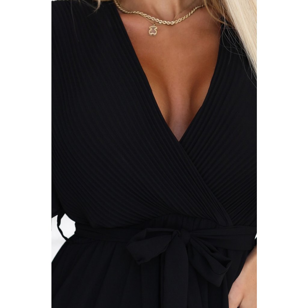 Numoco Dlhé šaty s plisovaným výstrihom a zaväzovaním - čierne 545-5