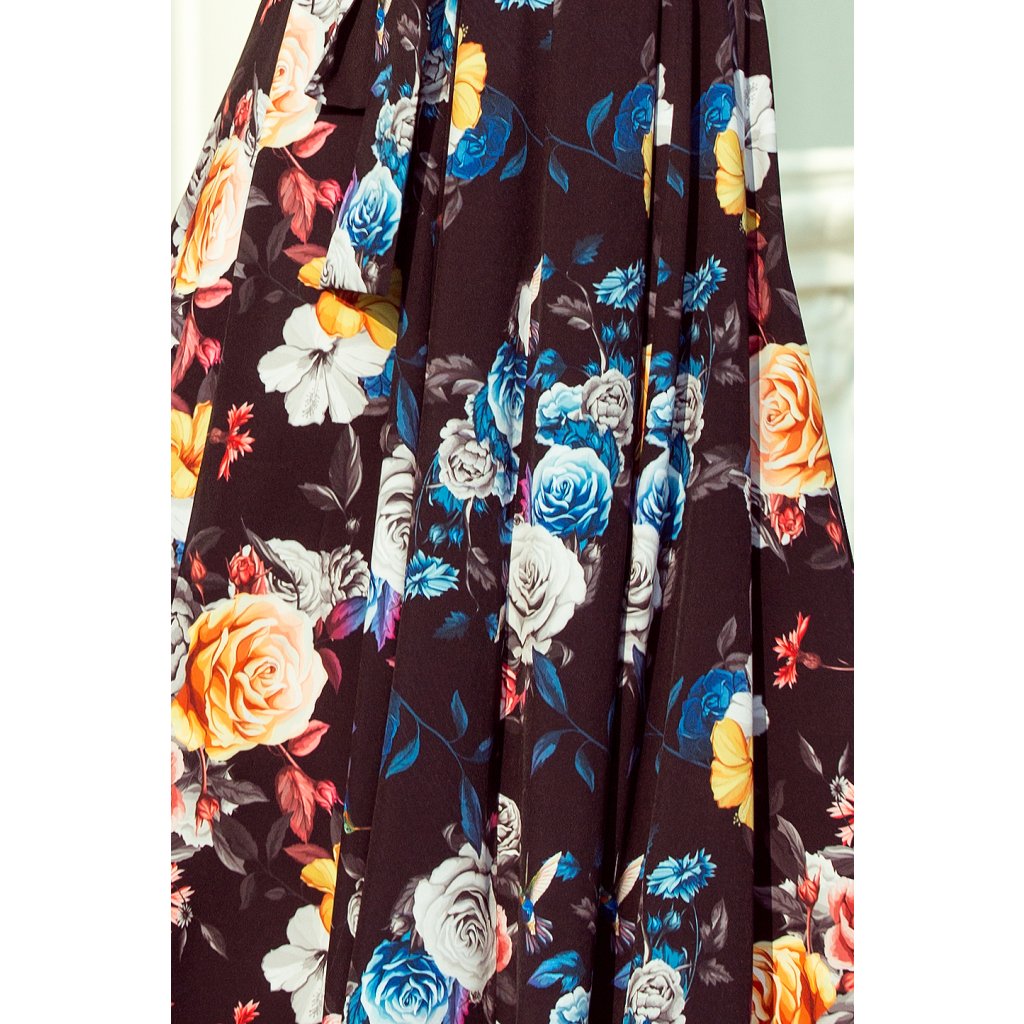 Šaty maxi s golierom - čierna s farebnými kvetmi