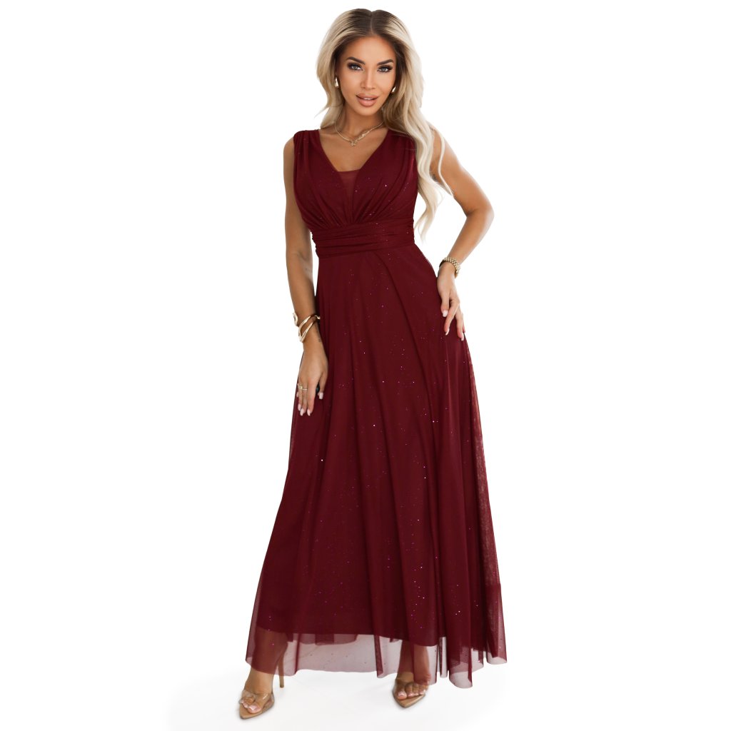 Dlhé večerné šaty s brokátovým akcentom a hlbokým výstrihom - vínové 637-1