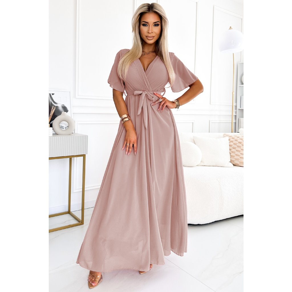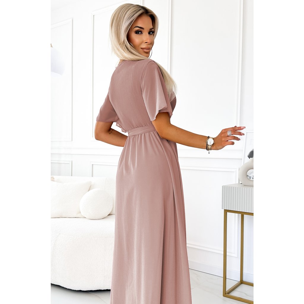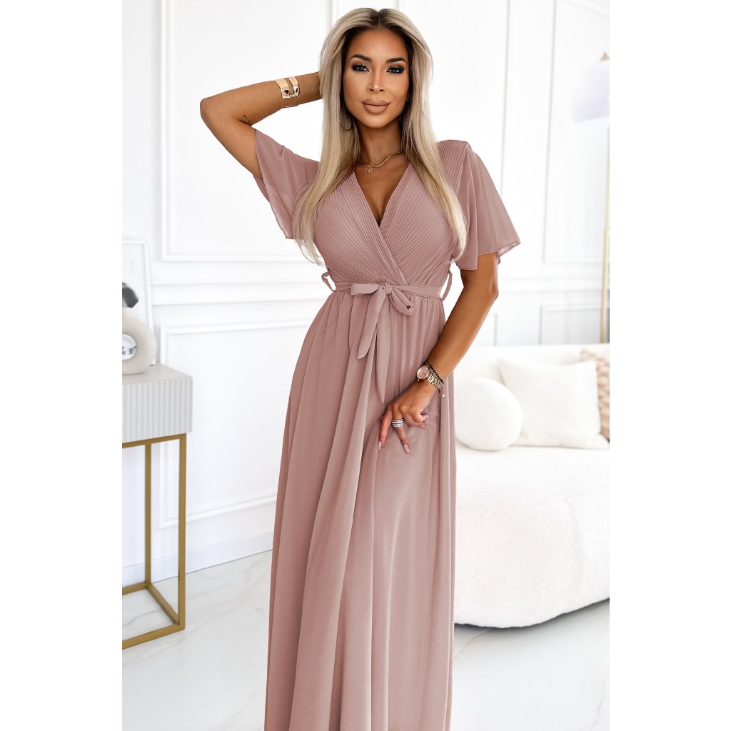 Dlouhé šaty s plisovaným výstřihem a zavazováním - taupe 545-6 - výprodej