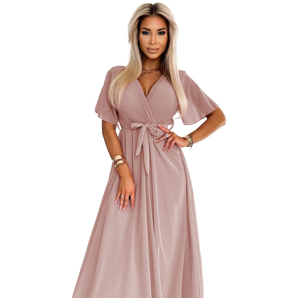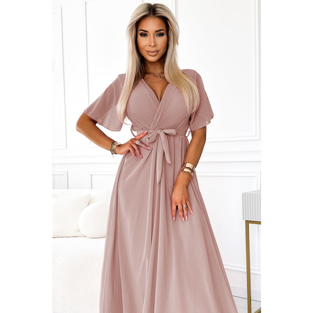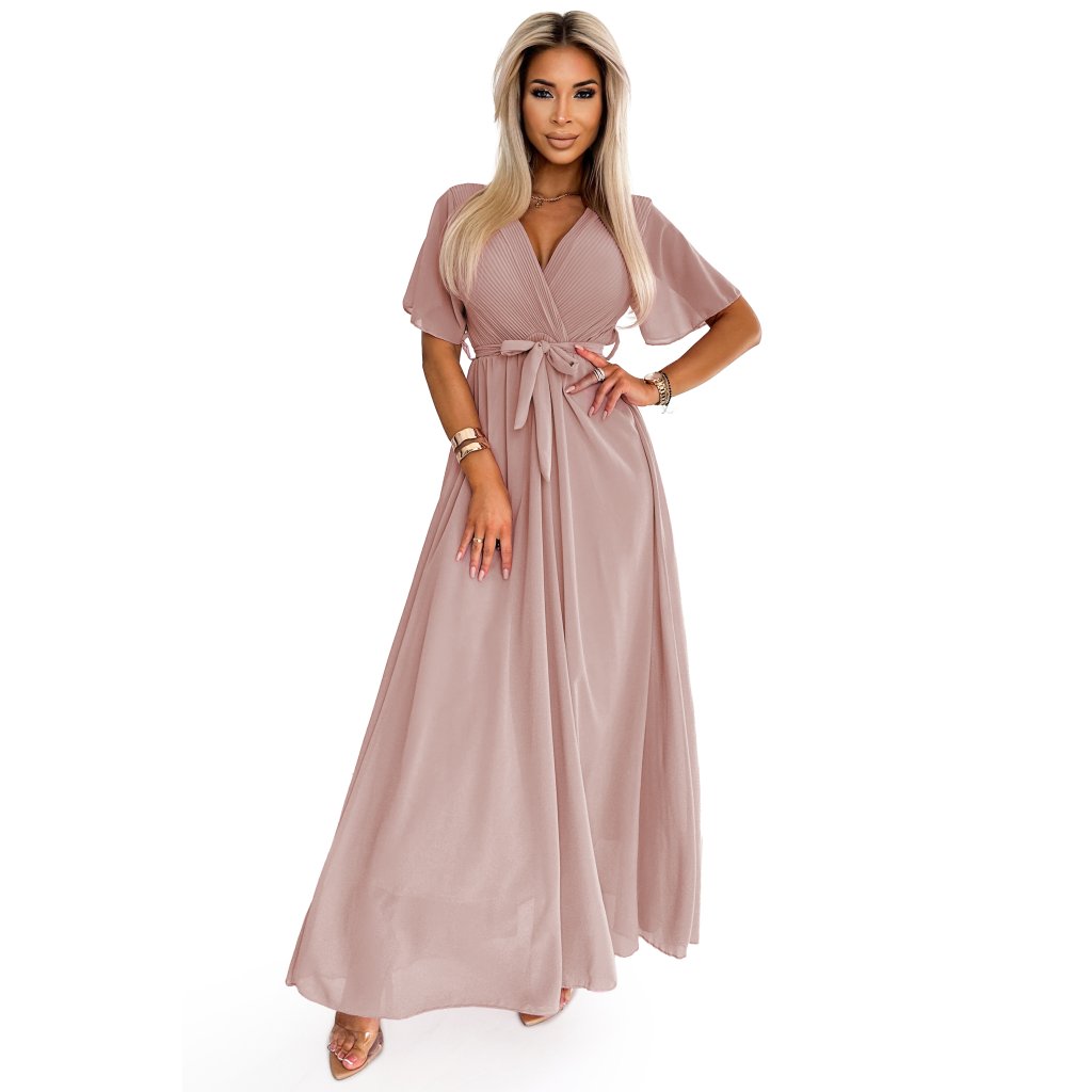 Dlouhé šaty s plisovaným výstřihem a zavazováním - taupe 545-6 - výprodej