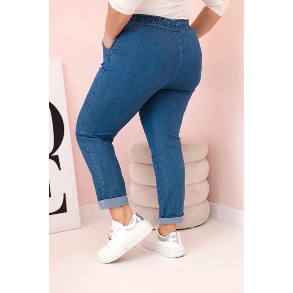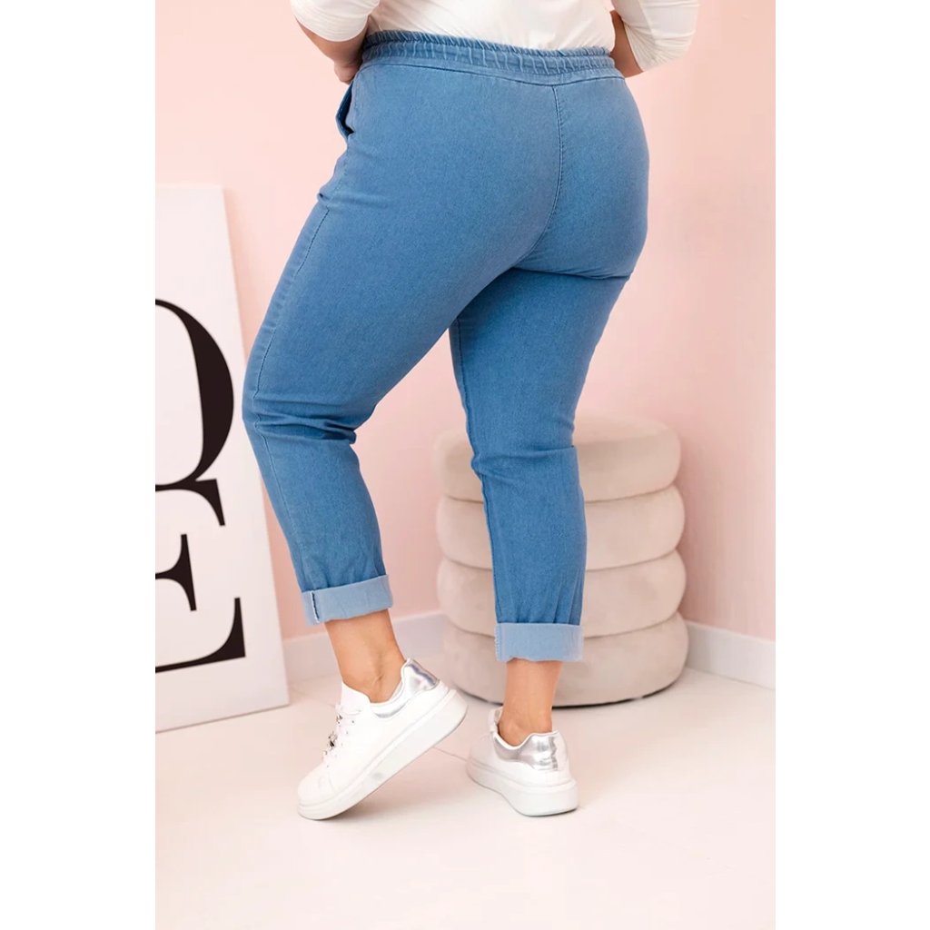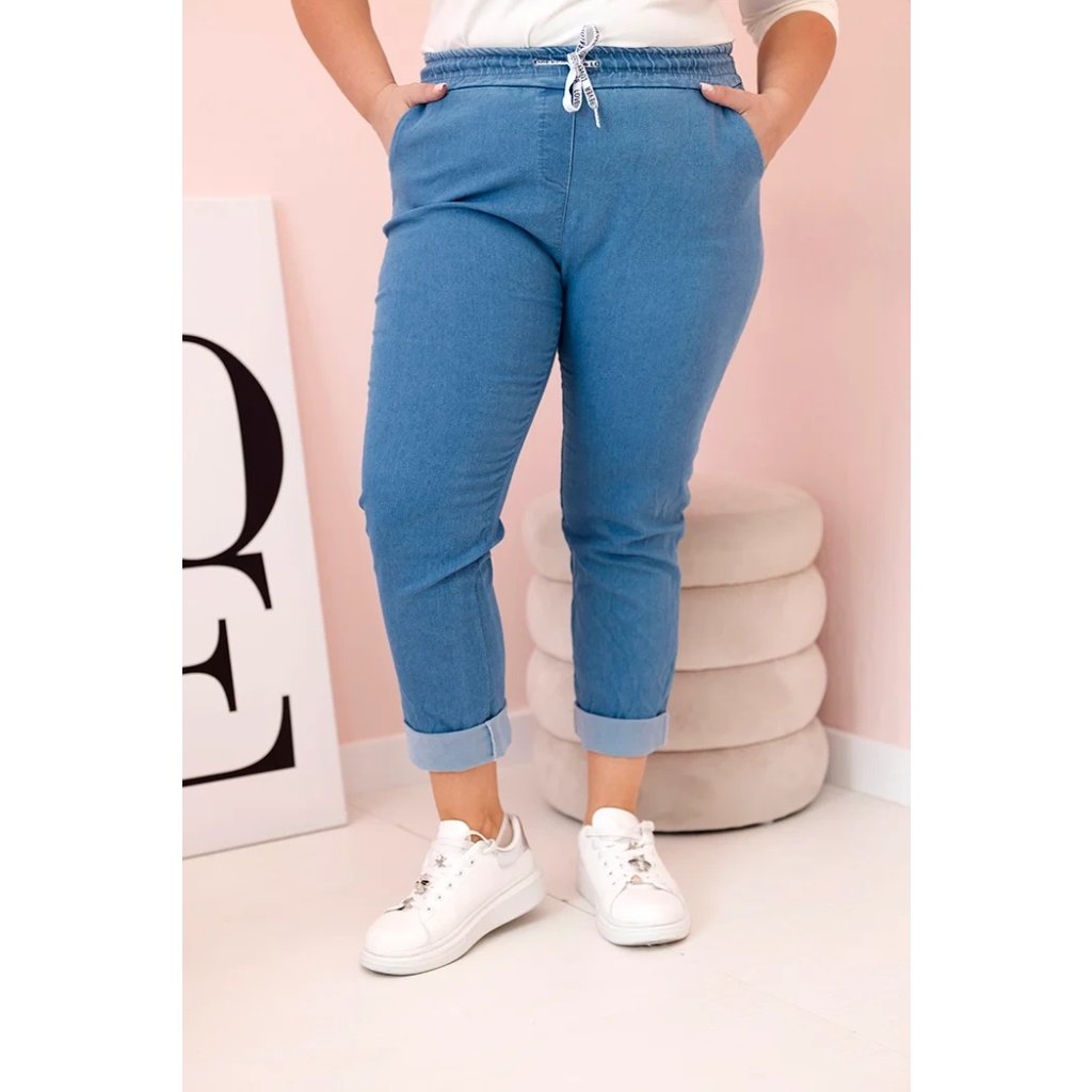 Ak si ceníte pohodlie a módny vzhľad v každodennom štýle, tieto dámske džínsové nohavice s elastickým pásom budú ideálnou voľbou! Vyrobené z mäkkého, pružného materiálu, zaisťujú maximálne pohodlie po celý deň. Vďaka sťahovaniu v páse na šnúrku sa dokonale prispôsobia postave, voľný strih a vyhrnuté nohavice dodávajú celkovo ležérny, neformálny štýl. Skvelá voľba na každý deň – na prechádzku, nákupy alebo neformálne stretnutie s priateľmi. Džínsová štruktúra a univerzálny dizajn zabezpečujú jednoduché kombinovanie s tričkom, mikinou alebo svetrom.