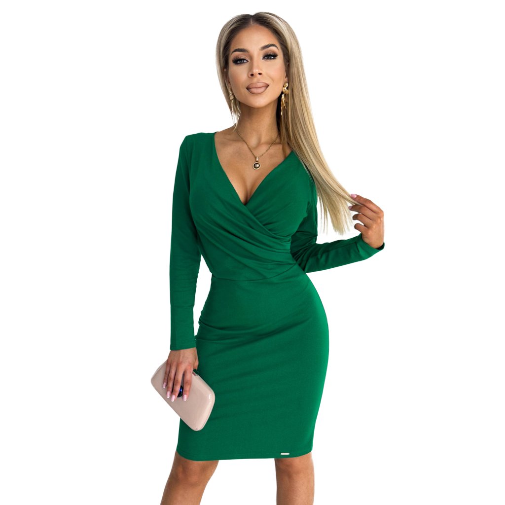 Elegantné šaty s listovým výstrihom a dlhým rukávom. Z ľahko elastického bavlneného materiálu v zelenej farbe. Zapínanie vzadu na skrytý zips. Značka Numoco. Poľská výroba.