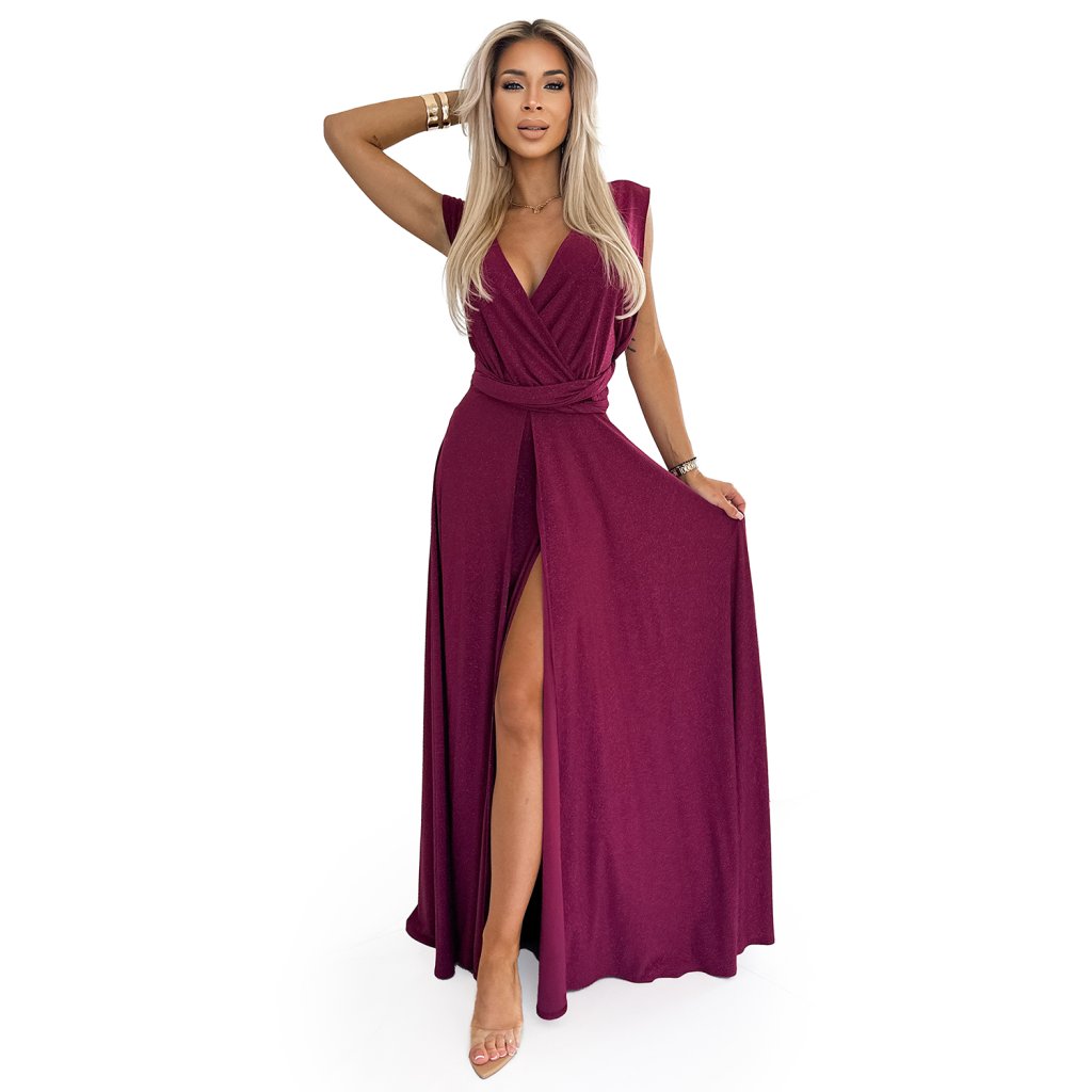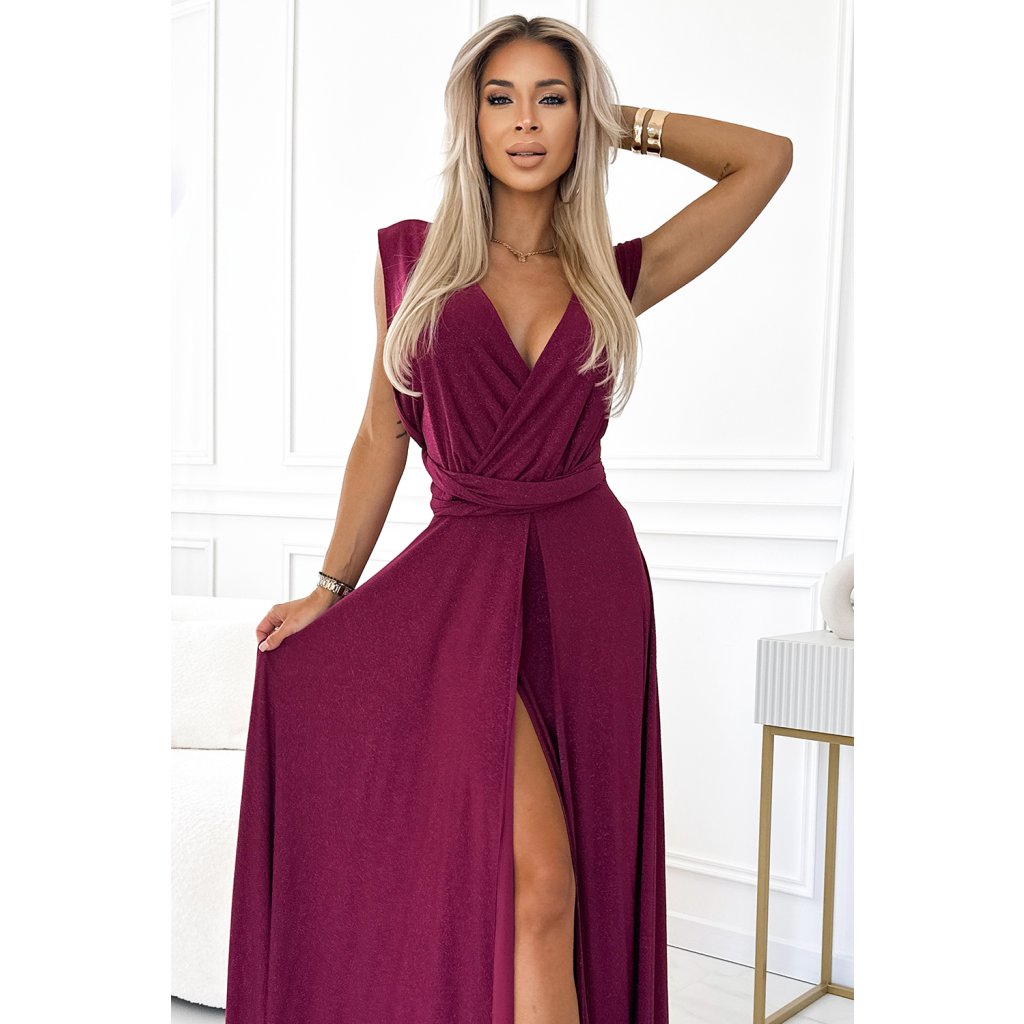 Elegantné dlhé maxi šaty, ktoré sa dajú zaviazať na mnoho spôsobov. Vyrobené z vínneho elastického materiálu s trblietkami. Poľská výroba. Značka Numoco.