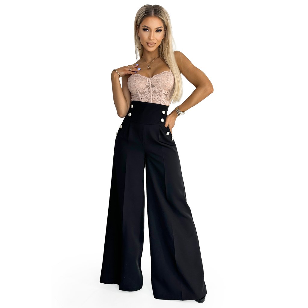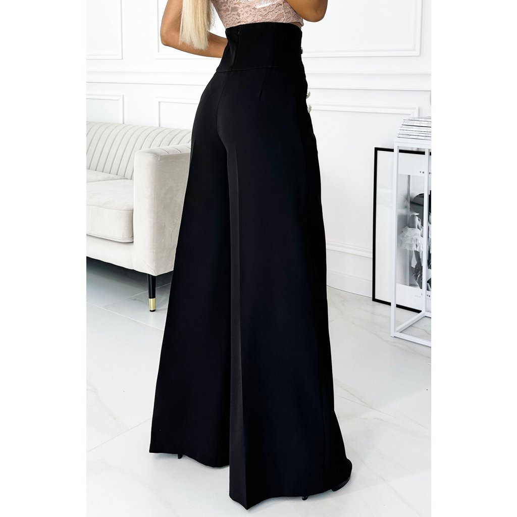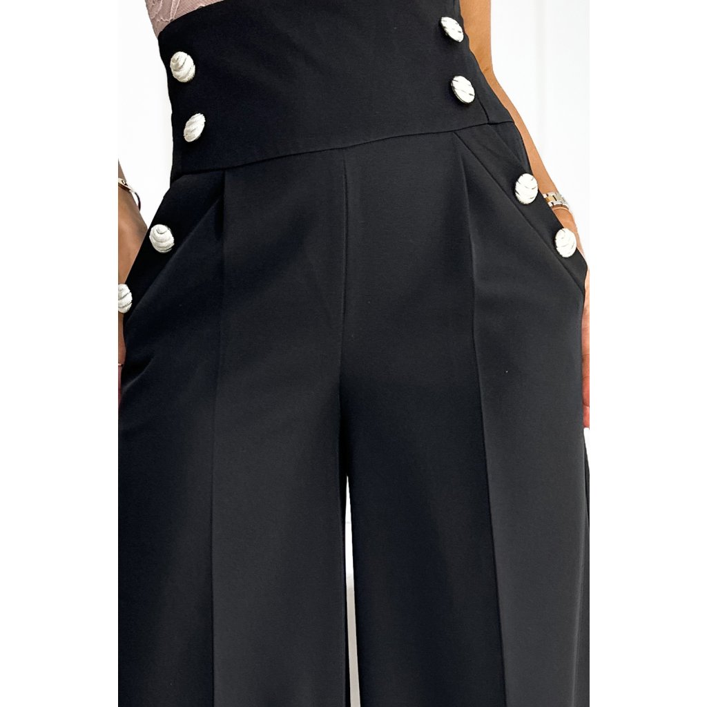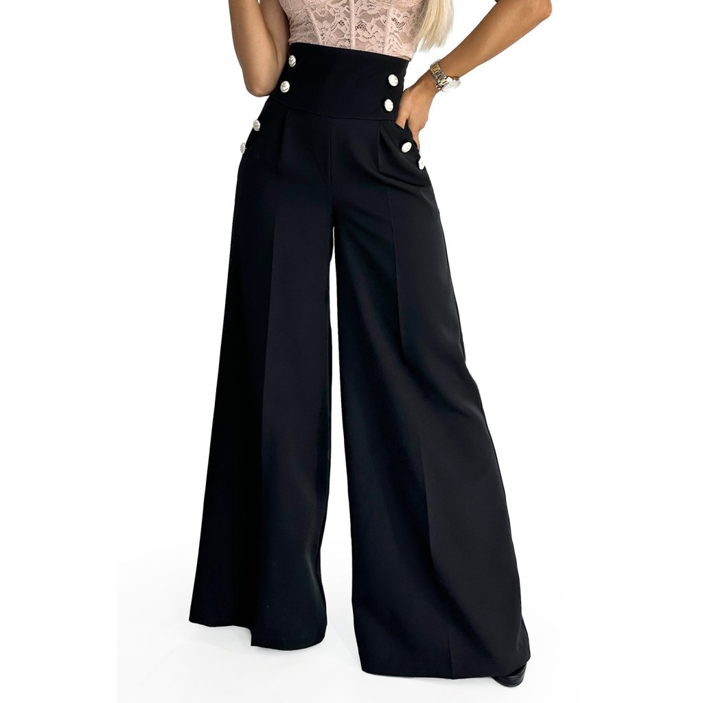 Numoco Elegantné široké nohavice s vysokým pásom a zlatými gombíkmi - čierne 496-1
