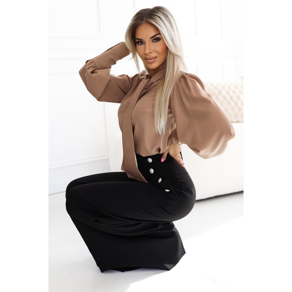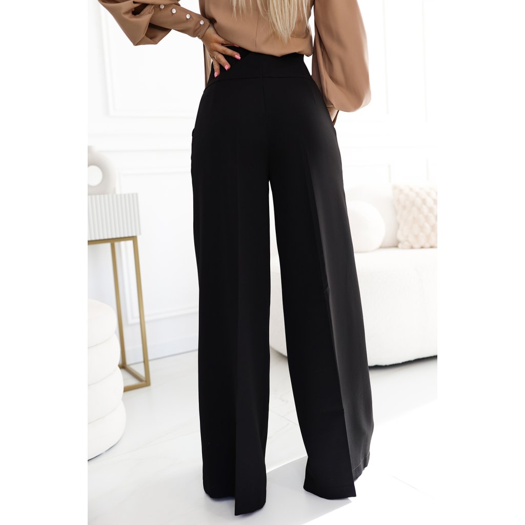Elegantné široké nohavice s vysokým pásom a zlatými gombíkmi - čierne 496-2