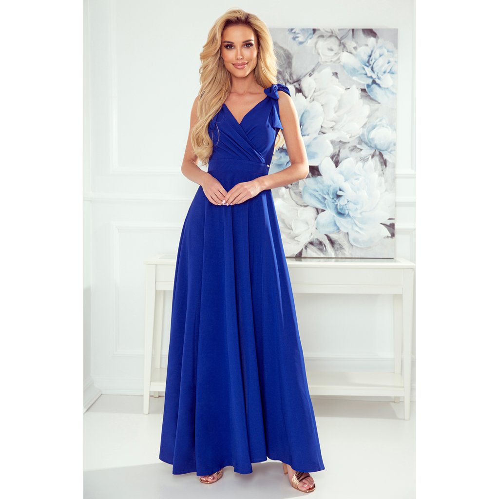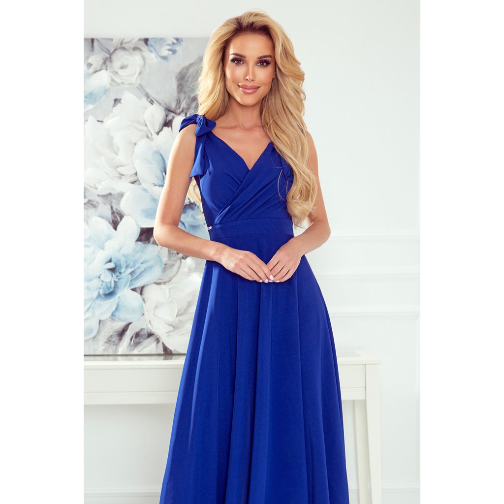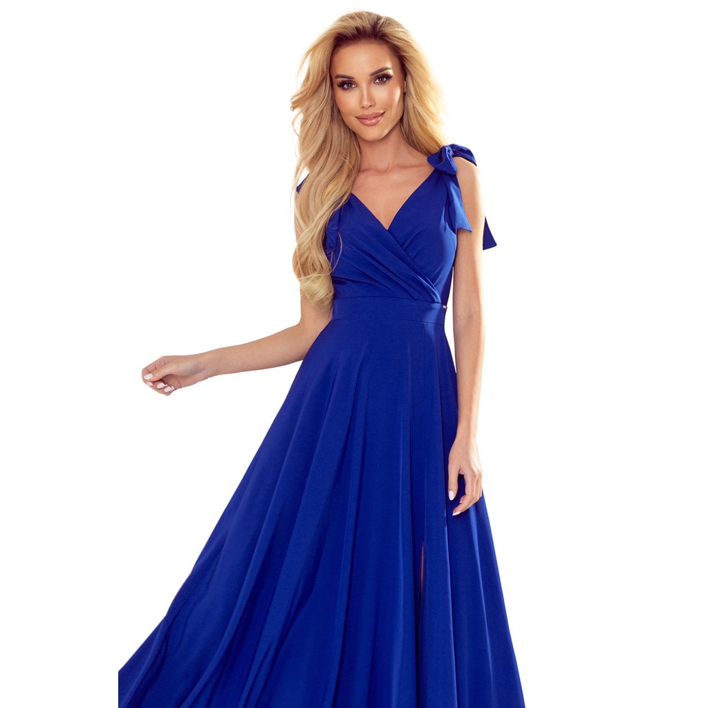 Numoco ELENA Dlhé šaty s výstrihom a zavázaním na ramenách - modré 405-2