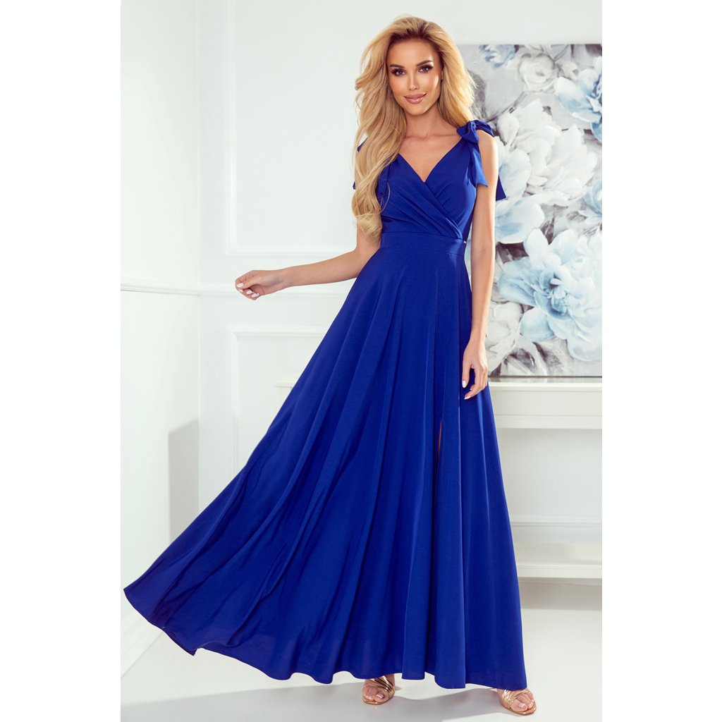 ELENA - dlhé šaty sú s výstrihom, rozparkom na nohavici a mašľami na ramene. Vyrobené z príjemného materiálu v módnej modrej farbe. Poľské remeslo. Značka Numoco.