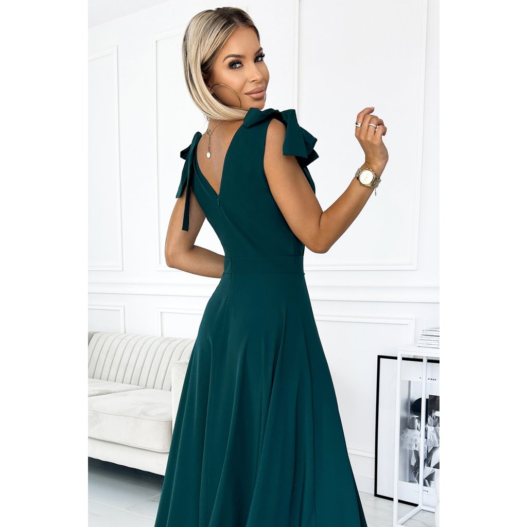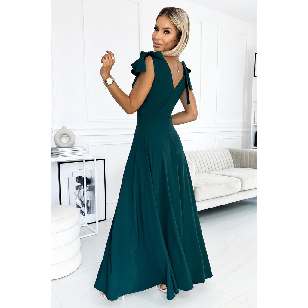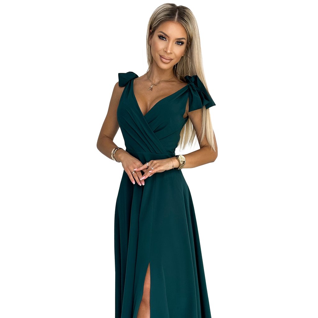 ELENA - dlhé šaty s výstrihom, rozparkom na nohavici a mašľami na ramenách. Vyrobené z na dotyk príjemného materiálu v zelenej farbe. Poľský výrobok. Značka Numoco.
