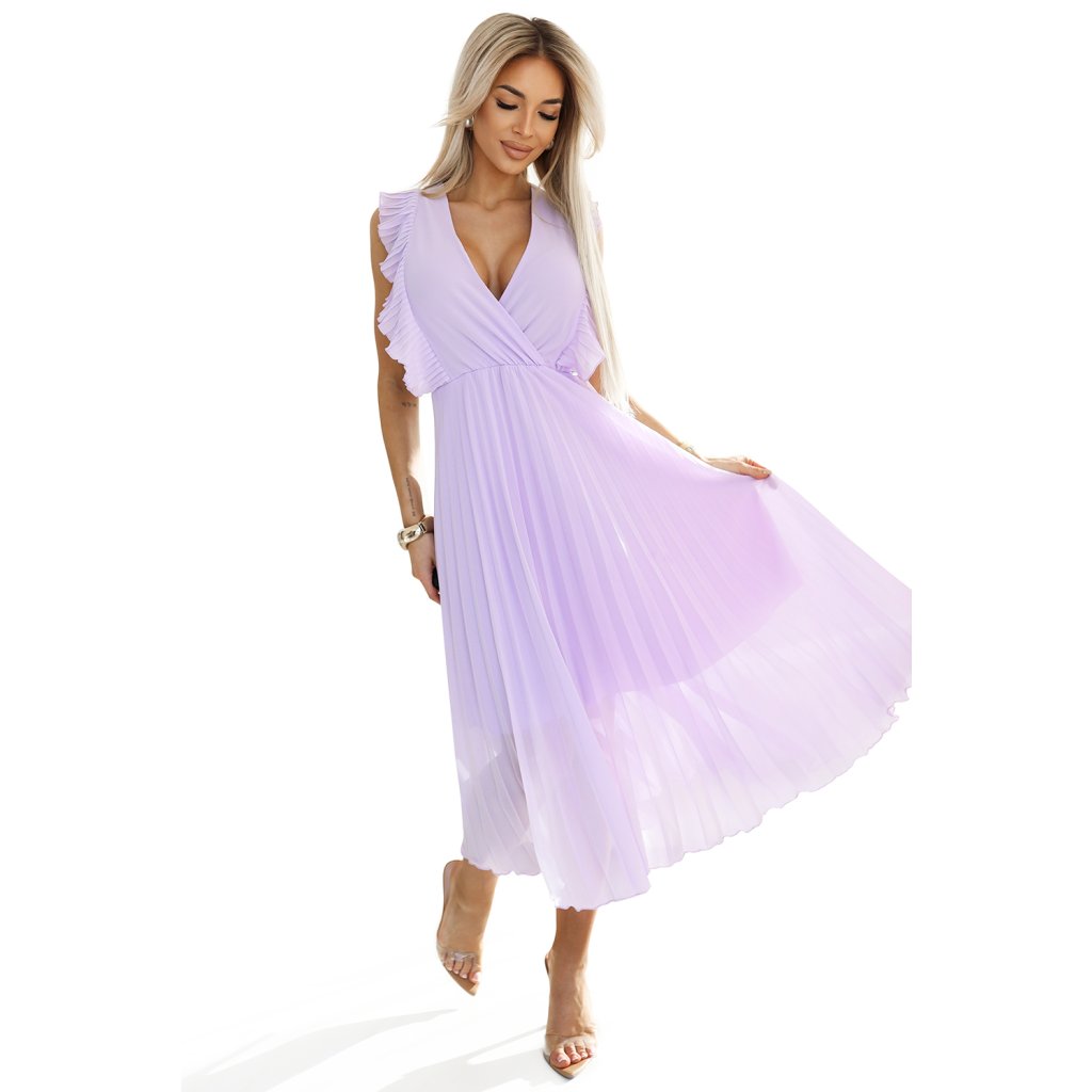 Emily – limitovaná edícia! Plisované šifónové midi šaty s véčkovým výstrihom a volánmi. Ľahké, vzdušné a ženské, ideálne na špeciálne príležitosti. Vresová farba. Poľský výrobok. Značka Numoco. ✨ LIMITOVANÁ EDÍCIA ✨