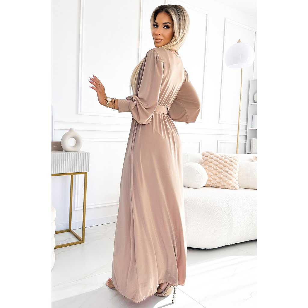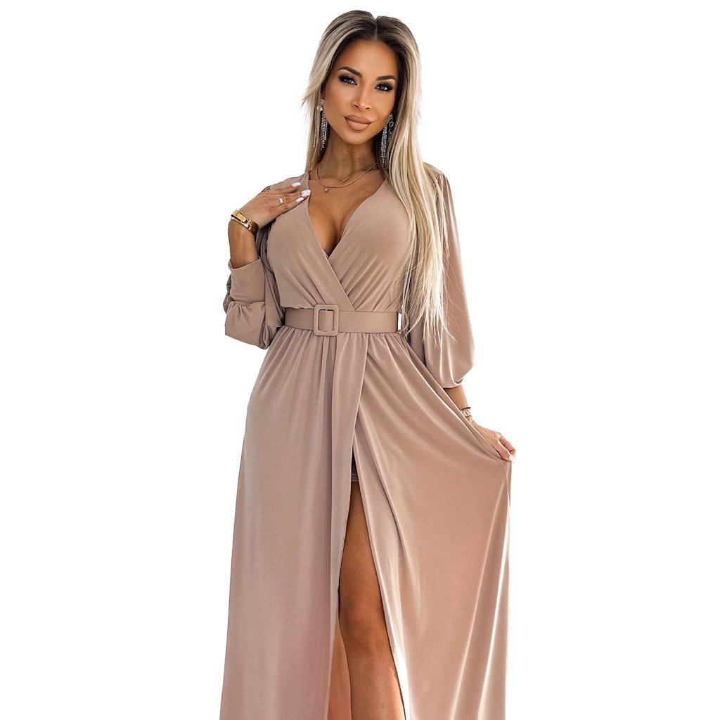 Maxi dlhé šaty so širokým opaskom, rozparkom a výstrihom. Vyrobené z pružného béžového materiálu. Európska produkcia. Základná značka Numoco.