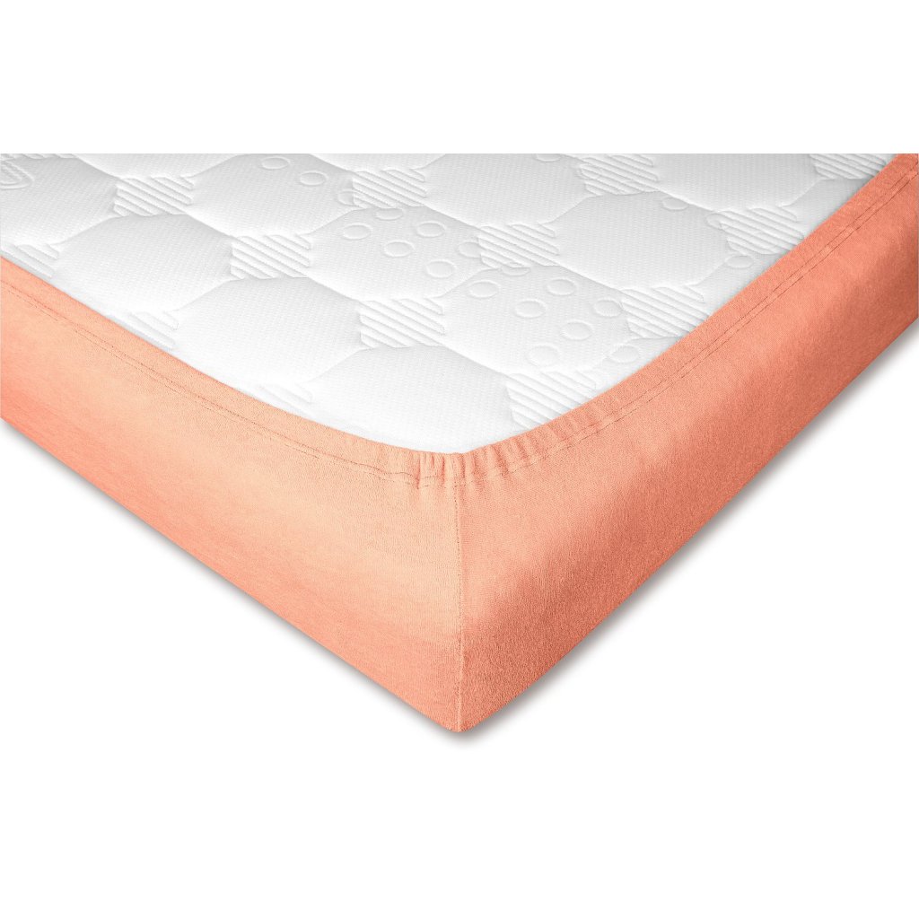 Marhuľová napínacia froté plachta je vyrobená z kvalitnej zmesi 80 % česanej bavlny a 20 % polyesteru. Tento materiál je pružný, rozmerovo stály, priedušný a príjemný na dotyk. Hebká froté slučka dodáva plachte jemnosť a komfort po celý rok.
