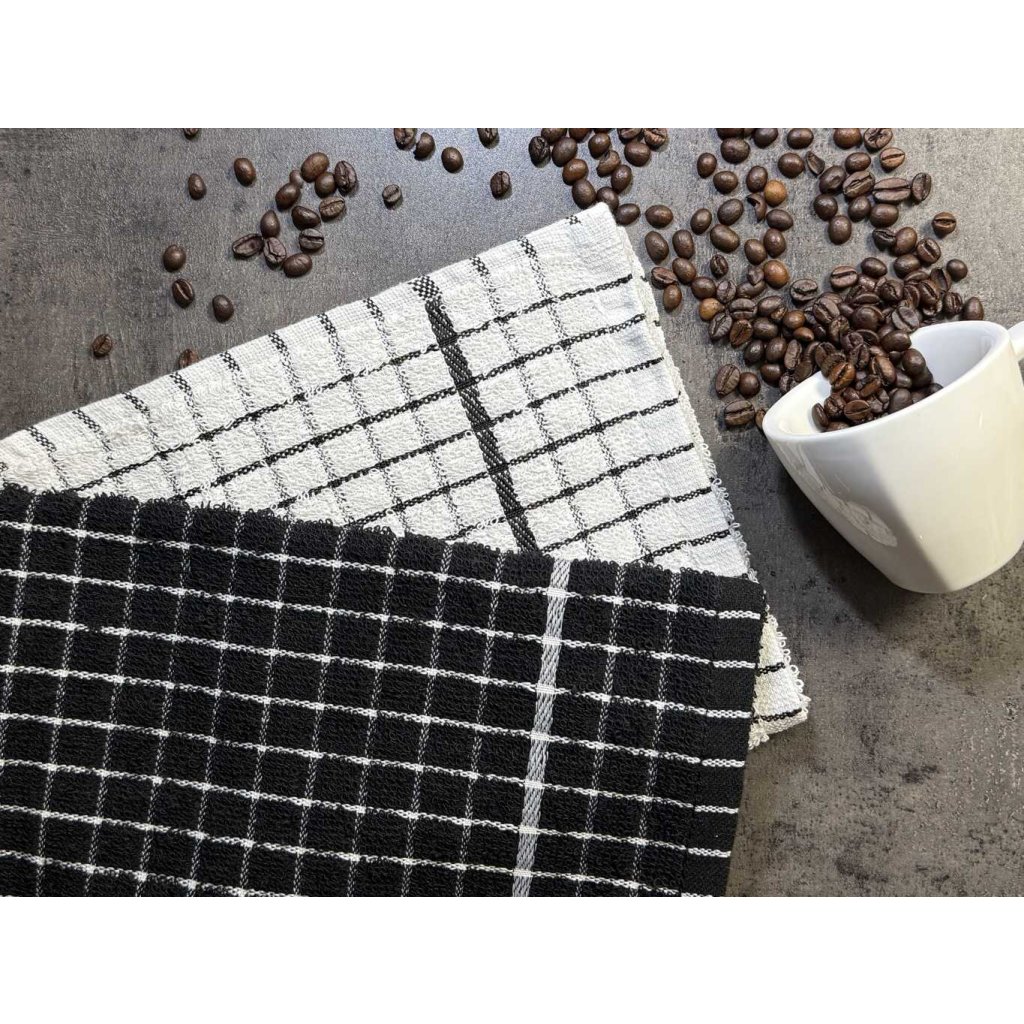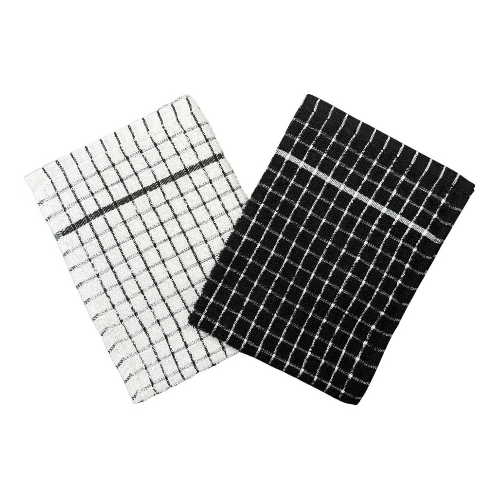Štýlové froté utierky Olga čiernobiela v praktickom balení po dvoch kusoch. Jedna utierka je biela s čiernym károm, druhá čierna s bielym károm – elegantný kontrastný dizajn, ktorý ozdobí každú kuchyňu. Vyrobené v Českej republike firmou DADKA VRACOV.