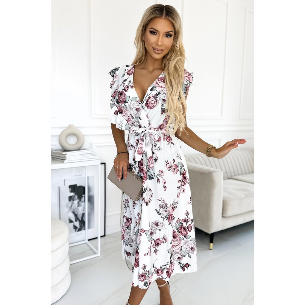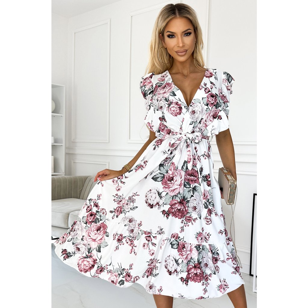 GABRIELLA - šaty s listovým výstrihom, riasením na ramenách a zaväzovaním v páse. Vzor: biela s gaštanovými ružami. Značka Numoco. Európska produkcia.