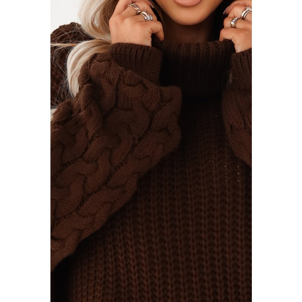 Tento čokoládový sveter je nesmierne univerzálny. Pre kontrast ho kombinujte s priliehavým spodkom – kožená mini sukňa (ako na fotografii) alebo voskované úzke nohavice budú fungovať skvele. V casual verzii ho skombinujte s obľúbenými džínsami a členkovými topánkami. Je to ideálny základ pre jesenno-zimnú štylizáciu.