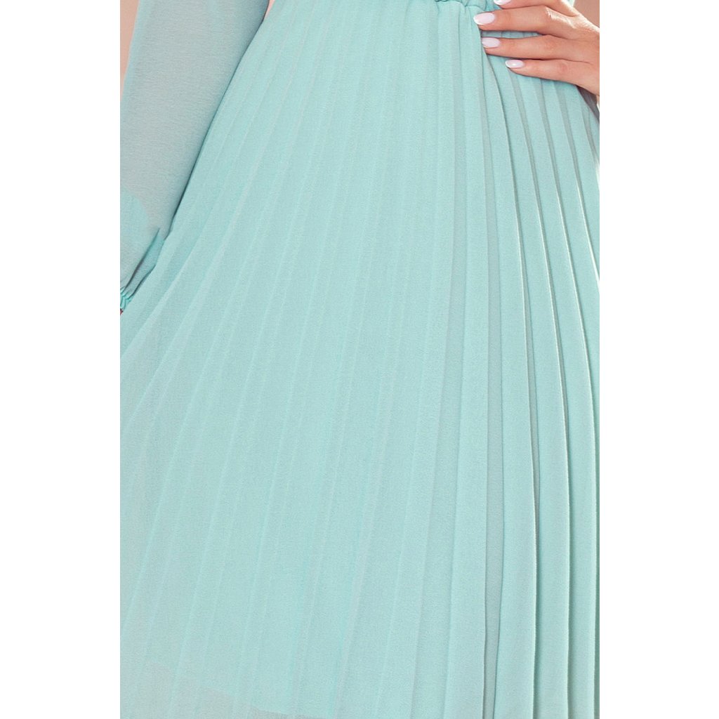 Isabella - plisované šifónové šaty s výstrihom a dlhým rukávom. Farba: mäta. Značka Numoco. Poľská produkcia.