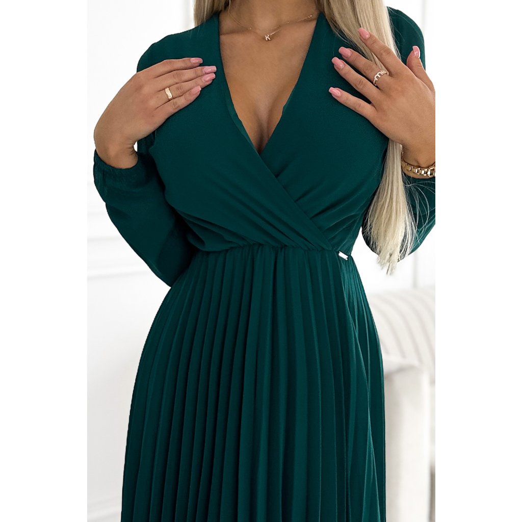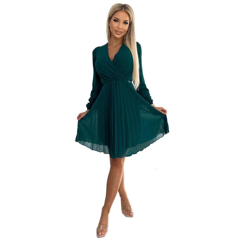 Isabella - riasené šifónové šaty s výstrihom a dlhými rukávmi. Farba: fľaškovo zelená. Celé šaty sú vyrobené z podšívky. Značka numoco. Poľská výroba.