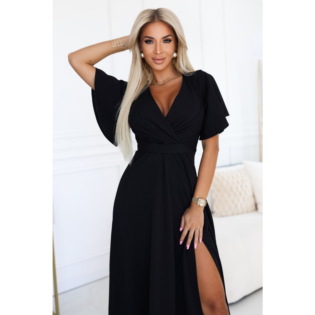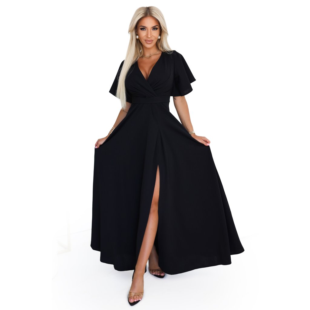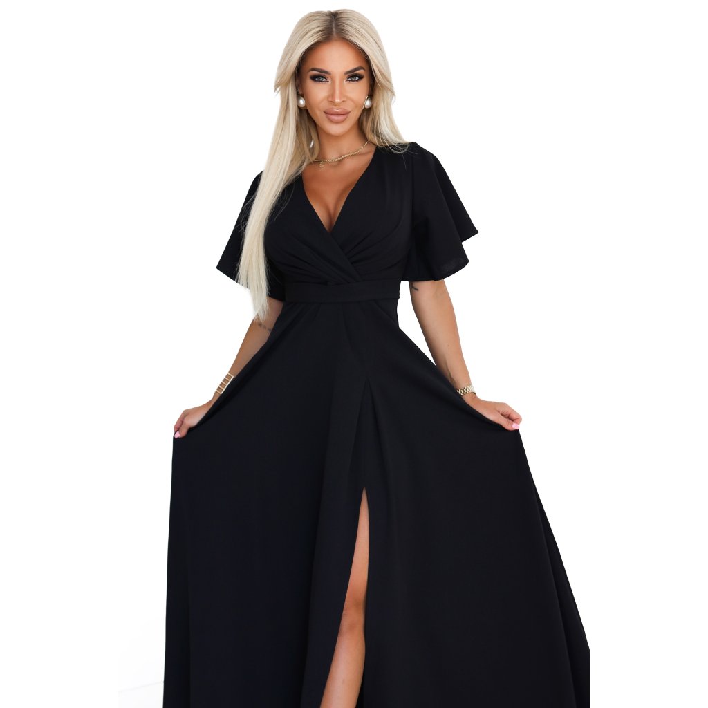 Dlhé čierne šaty s zavinovacím výstrihom, rozparkom na nohavici a krátkymi rukávmi. Elegantné, ľahké a výrazné – ideálne na svadby, stužkové a zvláštne príležitosti. Vyrobené v Poľsku. Značka: Numoco.