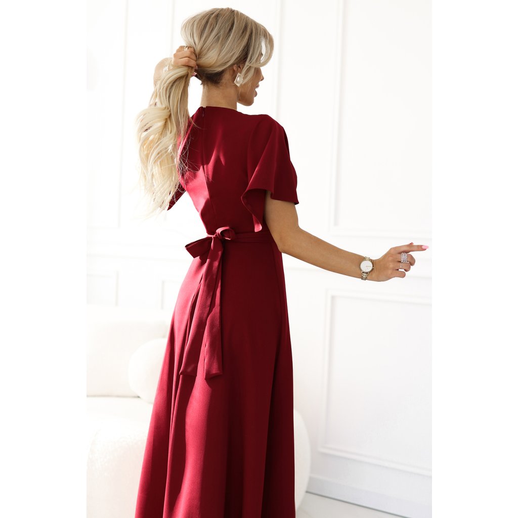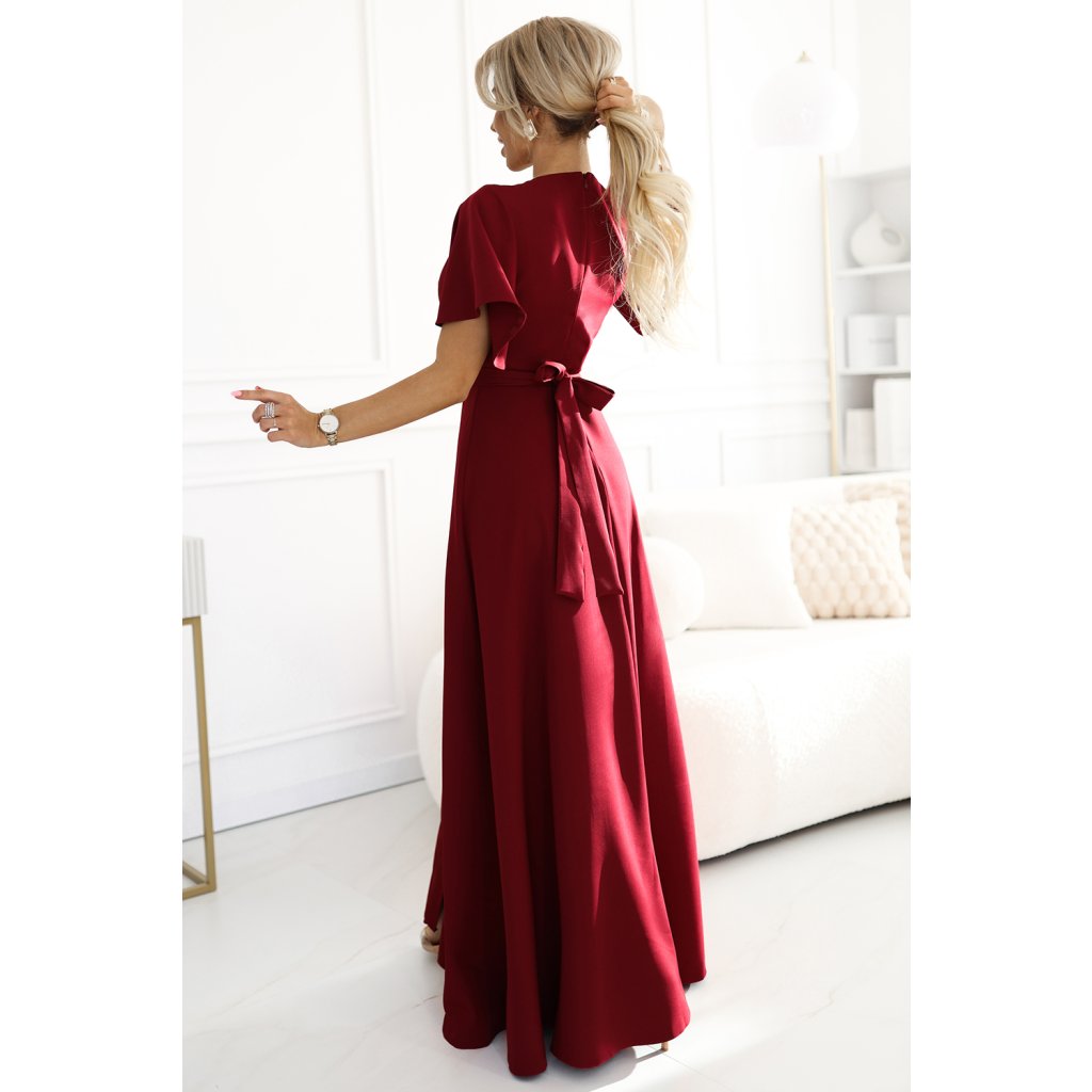 Dlhé exkluzívne šaty s krátkym rukávom a výstrihom - vínovej